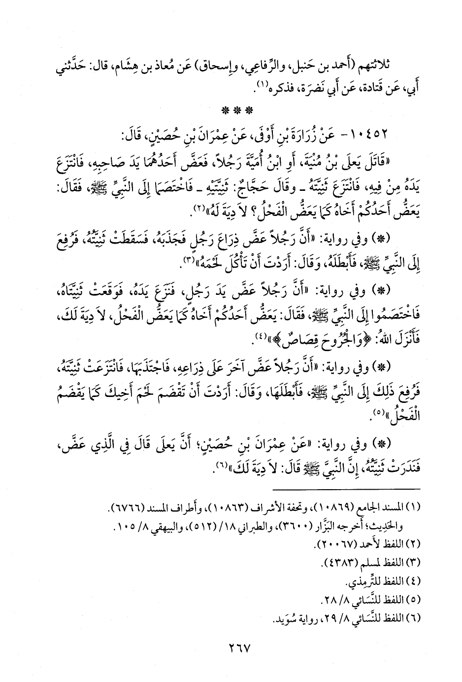 - وفي رواية: «أن رجلا عض آخر على ذراعه، فاجتذبها، فانتزعت ثنيته، فرفع ذلك إلى النبي صَلى الله عَليه وسَلم فأبطلها، وقال: أردت أن تقضم لحم أخيك كما يقضم الفحل» (¬٤).