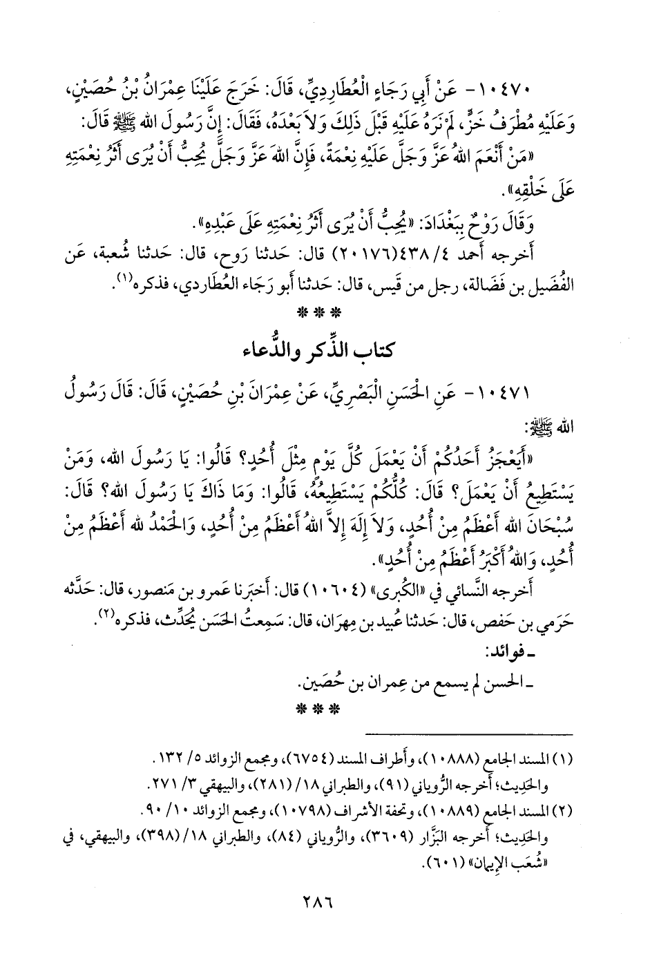 ١٠٤٧٠ - عن أبي رجاء العطاردي، قال: خرج علينا عمران بن حصين، وعليه مطرف خز، لم نره عليه قبل ذلك ولا بعده، فقال: إن رسول الله صَلى الله عَليه وسَلم قال: