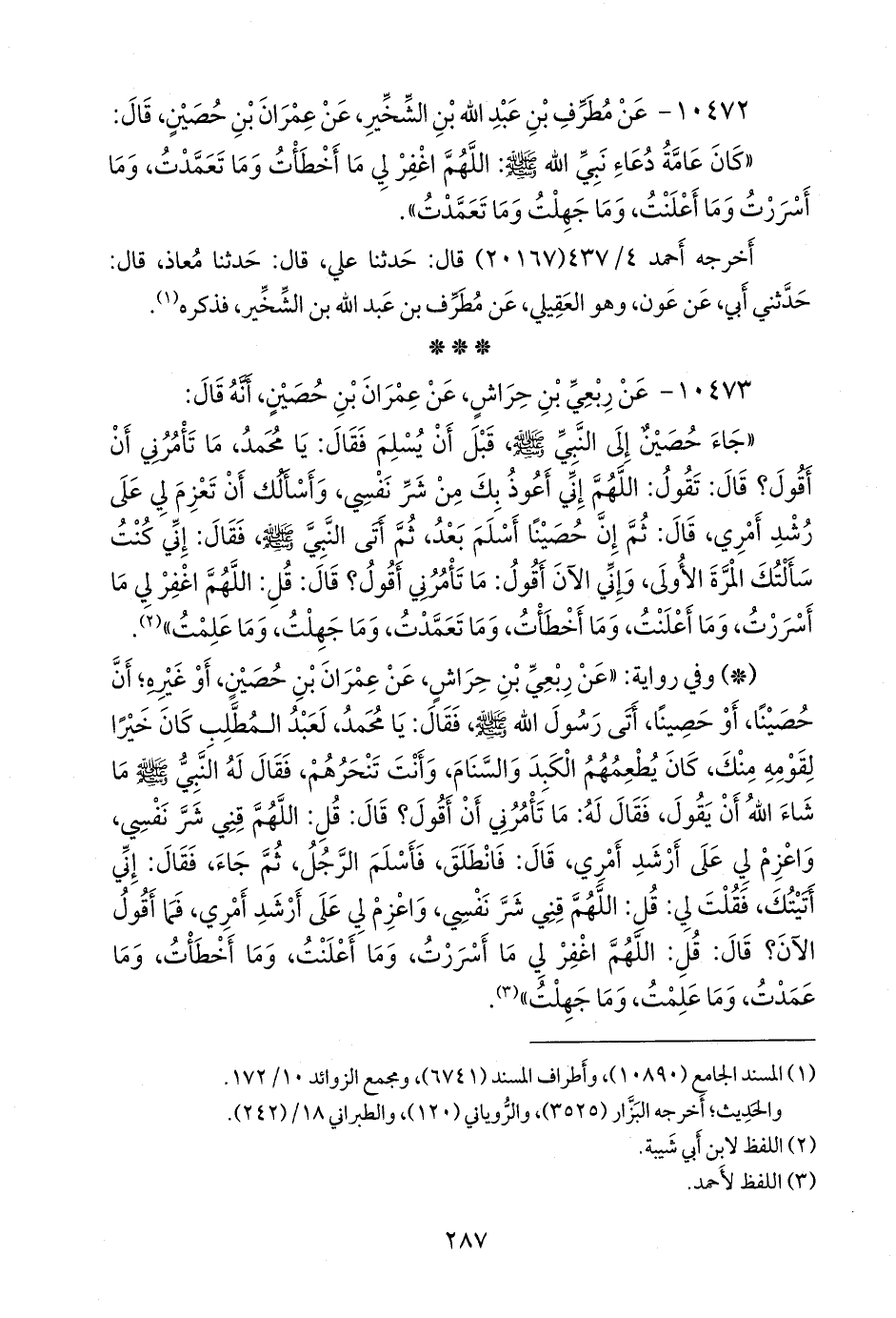 - وفي رواية: «عن رِبعي بن حِراش، عن عمران بن حصين، أو غيره؛ أن حصينا، أو حصينا، أتى رسول الله صَلى الله عَليه وسَلم فقال: يا محمد، لعبد المطلب كان خيرًا لقومه منك، كان يطعمهم الكبد والسنام، وأنت تنحرهم، فقال له النبي صَلى الله عَليه وسَلم ما شاء الله أن يقول، فقال له: ما تأمرني أن أقول؟ قال: قل: اللهم قني شر نفسي، واعزم لي على أرشد أمري، قال: فانطلق، فأسلم الرجل، ثم جاء، فقال: إني أتيتك، فقلت لي: قل: اللهم قني شر نفسي، واعزم لي على أرشد أمري، فما أقول الآن؟ قال: قل: اللهم اغفر لي ما أسررت، وما أعلنت، وما أخطأت، وما عمدت، وما علمت، وما جهلت» (¬٢).
