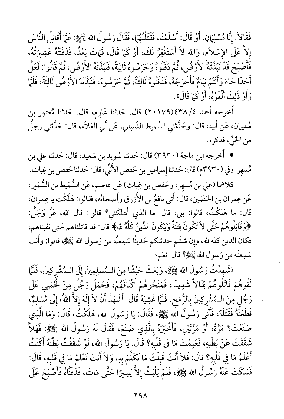 كلاهما (علي بن مُسهِر، وحفص بن غياث) عن عاصم، عن السميط بن السمير، عن عمران بن الحصين، قال: أتى نافع بن الأزرق وأصحابه، فقالوا: هلكت يا عمران، قال: ما هلكت، قالوا: بلى، قال: ما الذي أهلكني؟ قالوا: قال الله، عز وجل: {وقاتلوهم حتى لا تكون فتنة ويكون الدين كله لله} قال: قد قاتلناهم حتى نفيناهم، فكان الدين كله لله، وإن شئتم حدثتكم حديثا سمعته من رسول الله صَلى الله عَليه وسَلم قالوا: وأنت سمعته من رسول الله صَلى الله عَليه وسَلم؟ قال: نعم؛