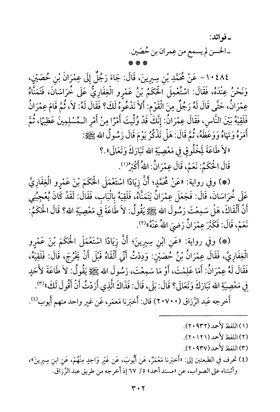 - وفي رواية: «عن محمد؛ أن زيادا استعمل الحكم بن عَمرو الغِفاري على خراسان، قال: فجعل عمران يتمناه، فلقيه بالباب، فقال: لقد كان يعجبني أن ألقاك، هل سمعتَ رسول الله صَلى الله عَليه وسَلم يقول: لا طاعة في معصية الله؟ قال الحكم: نعم، قال: فكبر عمران رضي الله عنه» (¬٢).