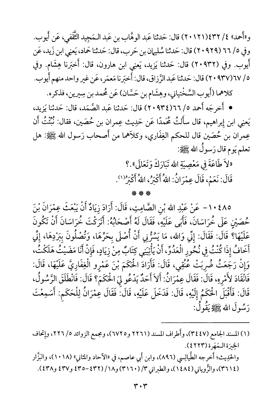 ١٠٤٨٥ - عن عبد الله بن الصامت، قال: أراد زياد أن يبعث عمران بن حصين على خراسان، فأبى عليه، فقال له أصحابه: أتركت خراسان أن تكون عليها؟ قال: فقال: إني والله، ما يسرني أن أصلى بحرها، وتصلون ببردها، إني أخاف إذا كنت في نحور العدو، أن يأتيني كتاب من زياد، فإن أنا مضيت هلكت، وإن رجعت ضربت عنقي، قال: فأراد الحكم بن عَمرو الغِفاري عليها، قال: فانقاد لأمره، قال: فقال عمران: ألا أحد يدعو لي الحكم؟ قال: فانطلق الرسول، قال: فأقبل الحكم إليه، قال: فدخل عليه، قال: فقال عمران للحكم: أسمعت رسول الله صَلى الله عَليه وسَلم يقول: