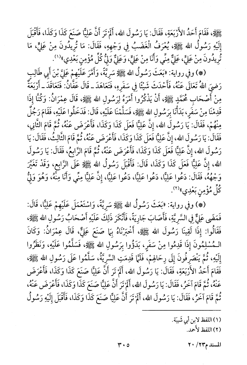 - وفي رواية: «بعث رسول الله صَلى الله عَليه وسَلم سرية، واستعمل عليهم عليا، قال: فمضى علي في السرية، فأصاب جارية، فأنكر ذلك عليه أصحاب رسول الله صَلى الله عَليه وسَلم فقالوا: إذا لقينا رسول الله صَلى الله عَليه وسَلم أخبرناه بما صنع علي، قال عمران: وكان المسلمون إذا قدموا من سفر، بدؤوا برسول الله صَلى الله عَليه وسَلم فسلموا عليه، ونظروا إليه، ثم ينصرفون إلى رحالهم، فلما قدمت السرية، سلموا على رسول الله صَلى الله عَليه وسَلم فقام أحد الأربعة، فقال: يا رسول الله، ألم تر أن عليا صنع كذا وكذا، فأعرض عنه، ثم قام آخر، فقال: يا رسول الله، ألم تر أن عليا صنع كذا وكذا، فأعرض عنه، ثم قام آخر، فقال: يا رسول الله، ألم تر أن عليا صنع كذا وكذا، فأقبل إليه رسول