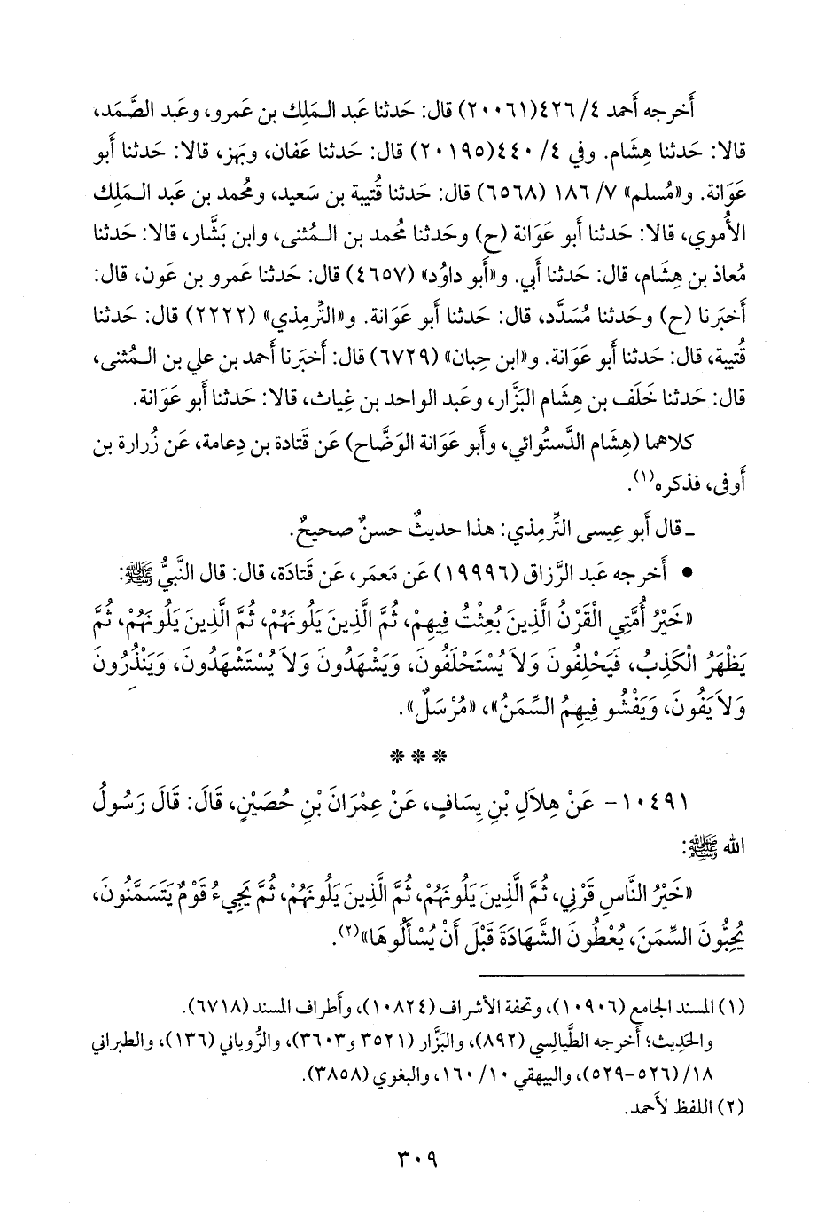 «خير أمتي القرن الذين بعثت فيهم، ثم الذين يلونهم، ثم الذين يلونهم، ثم يظهر الكذب، فيحلفون ولا يستحلفون، ويشهدون ولا يستشهدون، وينذرون ولا يفون، ويفشو فيهم السمن»، «مُرسَل».