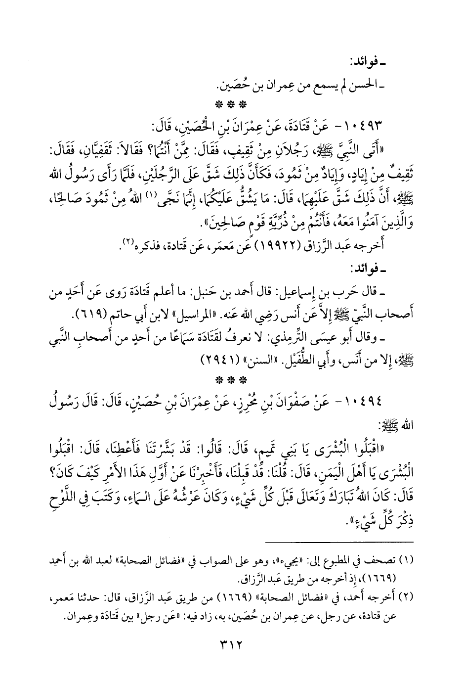 (¬٢) أخرجه أحمد في «فضائل الصحابة» (١٦٦٩) من طريق عبد الرزاق، قال: حدثنا مَعمَر، عن قتادة، عن رجل، عن عمران بن حصين، به، زاد فيه: «عن رجل» بين قتادة وعمران.