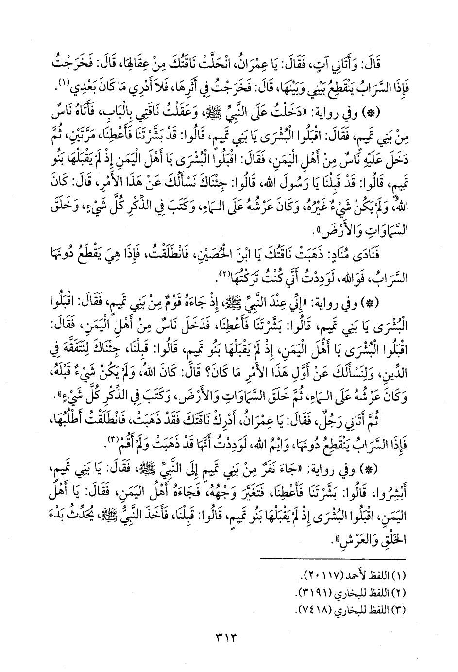 - وفي رواية: «إني عند النبي صَلى الله عَليه وسَلم إذ جاءه قوم من بني تميم، فقال: اقبلوا البشرى يا بني تميم، قالوا: بشرتنا فأعطنا، فدخل ناس من أهل اليمن، فقال: اقبلوا البشرى يا أهل اليمن، إذ لم يقبلها بنو تميم، قالوا: قبلنا، جئناك لنتفقه في الدين، ولنسألك عن أول هذا الأمر ما كان؟ قال: كان الله، ولم يكن شيء قبله، وكان عرشه على الماء، ثم خلق السماوات والأرض، وكتب في الذكر كل شيء».