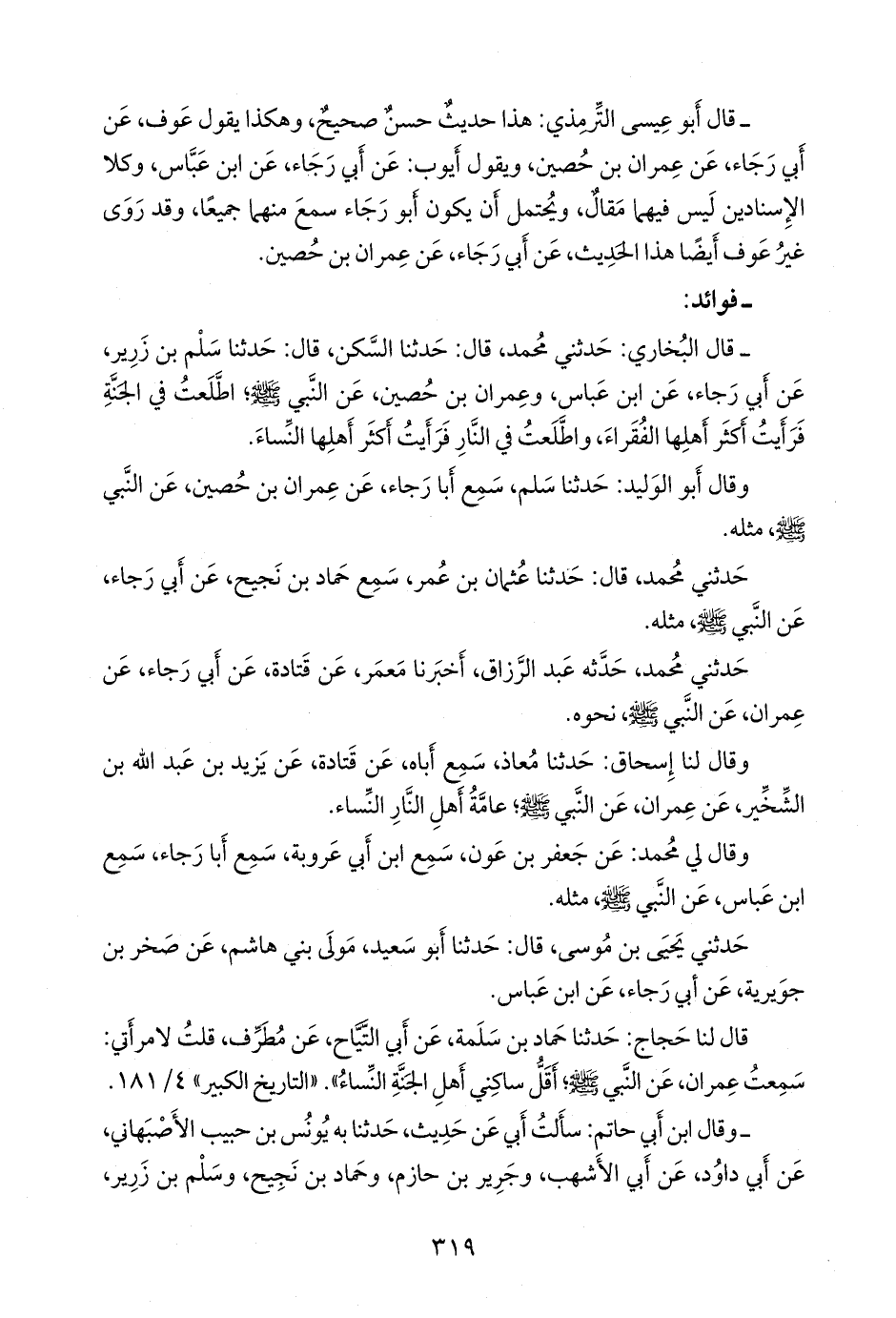 قال لنا حجاج: حدثنا حماد بن سلمة، عن أبي التياح، عن مطرف، قلت لامرأتي: سمعت عمران، عن النبي صَلى الله عَليه وسَلم؛ أقل ساكني أهل الجنة النساء». «التاريخ الكبير» ٤/ ١٨١.