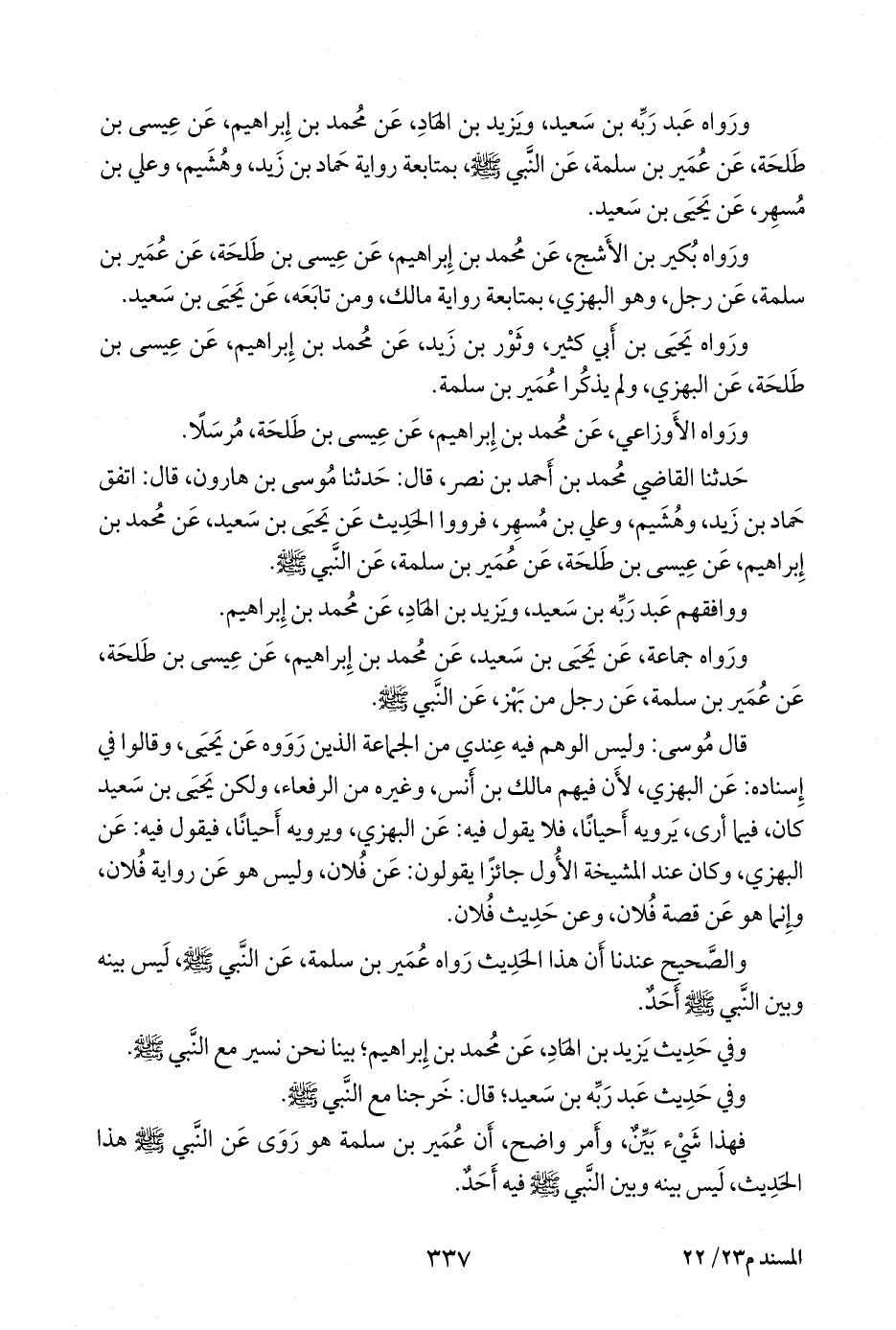 حدثنا القاضي أَبو عمر محمد بن يوسف، قال: حدثنا إسماعيل بن إسحاق، قال: قولهم: عن البَهزي، زيادة في الإسناد، لا أنه من رواية البَهزي، عن النبي صَلى الله عَليه وسَلم وإنما رواه عمير بن سلمة الضمري، عن النبي صَلى الله عَليه وسَلم وقال عمير بن سلمة فيه: فجاء رجل من بَهز، فقال: يا رسول الله، شأنكم بهذا الحمار، ولكن يحيى بن سعيد كان كثيرا يقول فيه: عن البَهزي، وكان أحيانا لا يقول فيه: عن البَهزي، وحماد بن زيد ممن رواه عنه، فلم يقل فيه: عن البَهزي، وهُشيم ممن رواه عنه، فلم يقل: عن البَهزي.
