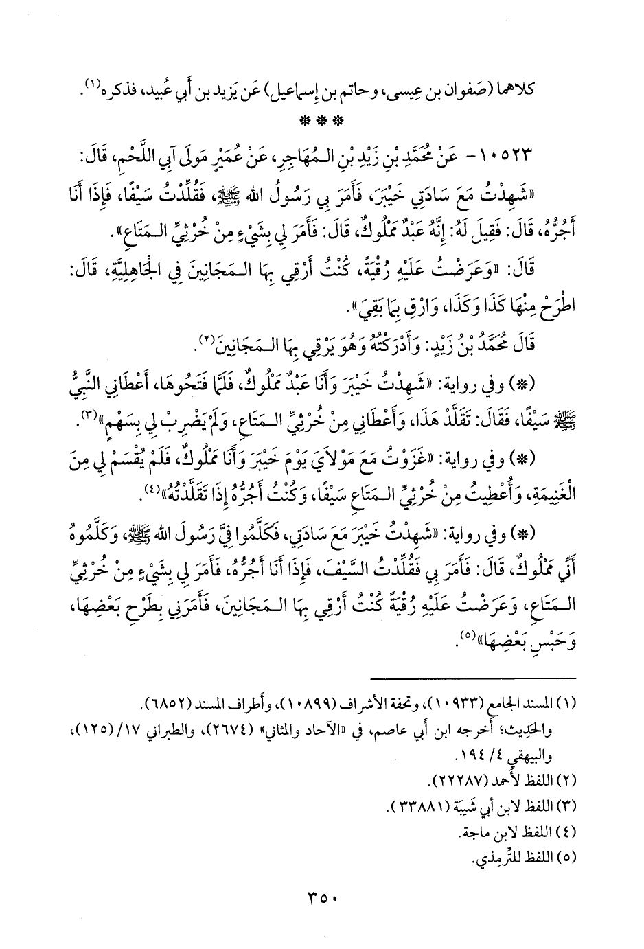 - وفي رواية: «شهدت حنينا وأنا عبد مملوك، فقلت: يا رسول الله، سهمي، فأعطاني سيفا، وقال: تقلده، وأعطاني من خرثي المتاع» (¬٥).