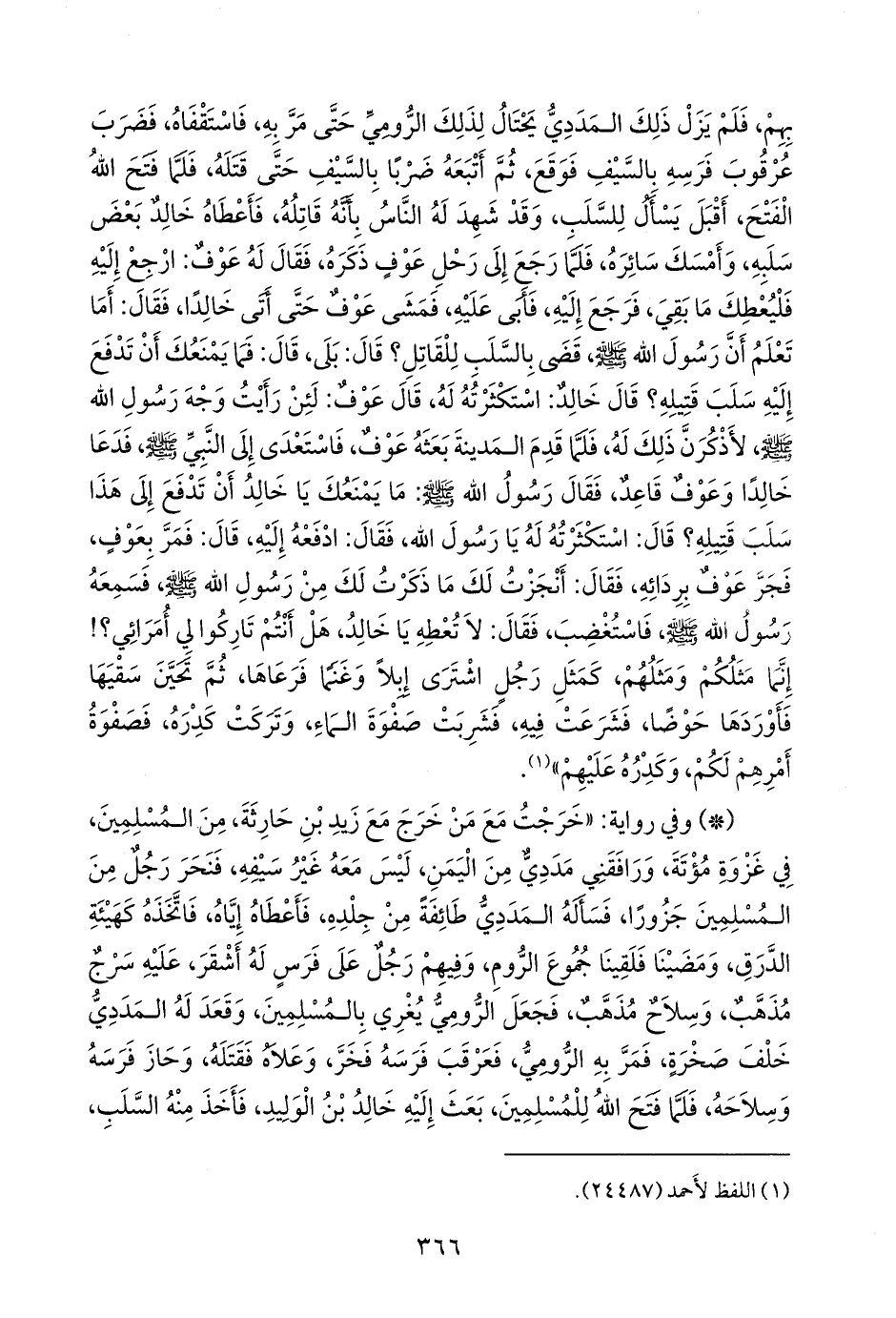 - وفي رواية: «خرجت مع من خرج مع زيد بن حارثة، من المسلمين، في غزوة مؤتة، ورافقني مددي من اليمن، ليس معه غير سيفه، فنحر رجل من المسلمين جزورا، فسأله المددي طائفة من جلده، فأعطاه إياه، فاتخذه كهيئة الدرق، ومضينا فلقينا جموع الروم، وفيهم رجل على فرس له أشقر، عليه سرج مذهب، وسلاح مذهب، فجعل الرومي يغري بالمسلمين، وقعد له المددي خلف صخرة، فمر به الرومي، فعرقب فرسه فخر، وعلاه فقتله، وحاز فرسه وسلاحه، فلما فتح الله للمسلمين، بعث إليه خالد بن الوليد، فأخذ منه السلب،