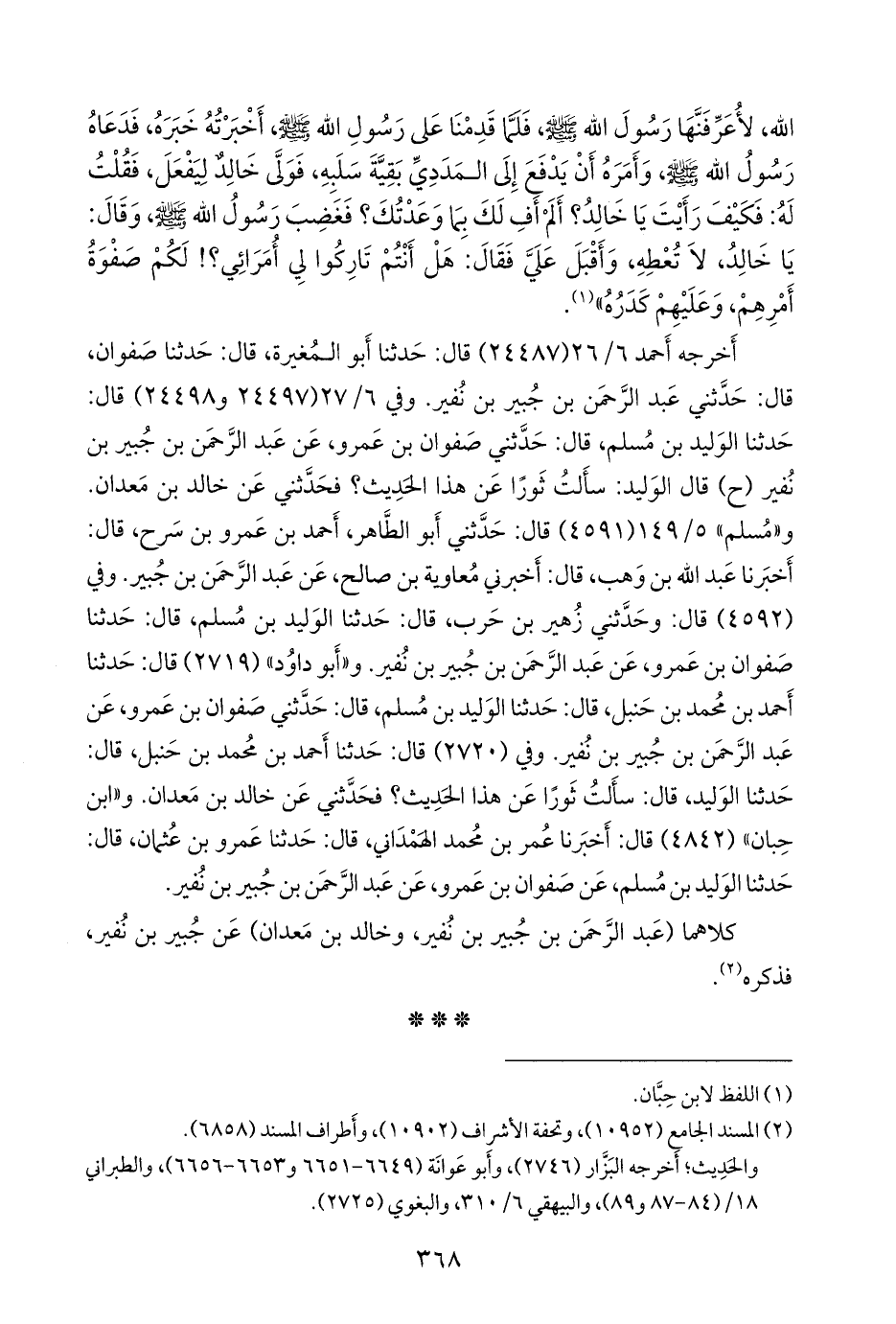 أخرجه أحمد (٢٤٤٨٧) قال: حدثنا أَبو المغيرة، قال: حدثنا صفوان، قال: حدثني عبد الرَّحمَن بن جُبير بن نُفير. وفي ٦/ ٢٧ (٢٤٤٩٧ و ٢٤٤٩٨) قال: حدثنا الوليد بن مسلم، قال: حدثني صفوان بن عَمرو، عن عبد الرَّحمَن بن جُبير بن نُفير (ح) قال الوليد: سألت ثورا عن هذا الحديث؟ فحدثني عن خالد بن مَعدان. و «مسلم» ٥/ ١٤٩ (٤٥٩١) قال: حدثني أَبو الطاهر، أحمد بن عَمرو بن سرح، قال: أخبرنا عبد الله بن وهب، قال: أخبرني معاوية بن صالح، عن عبد الرَّحمَن بن جبير. وفي (٤٥٩٢) قال: وحدثني زهير بن حرب، قال: حدثنا الوليد بن مسلم، قال: حدثنا صفوان بن عَمرو، عن عبد الرَّحمَن بن جُبير بن نُفير. و «أَبو داود» (٢٧١٩) قال: حدثنا أحمد بن محمد بن حنبل، قال: حدثنا الوليد بن مسلم، قال: حدثني صفوان بن عَمرو، عن عبد الرَّحمَن بن جُبير بن نُفير. وفي (٢٧٢٠) قال: حدثنا أحمد بن محمد بن حنبل، قال: حدثنا الوليد، قال: سألت ثورا عن هذا الحديث؟ فحدثني عن خالد بن مَعدان. و «ابن حِبَّان» (٤٨٤٢) قال: أخبرنا عمر بن محمد الهمداني، قال: حدثنا عَمرو بن عثمان، قال: حدثنا الوليد بن مسلم، عن صفوان بن عَمرو، عن عبد الرَّحمَن بن جُبير بن نُفير.