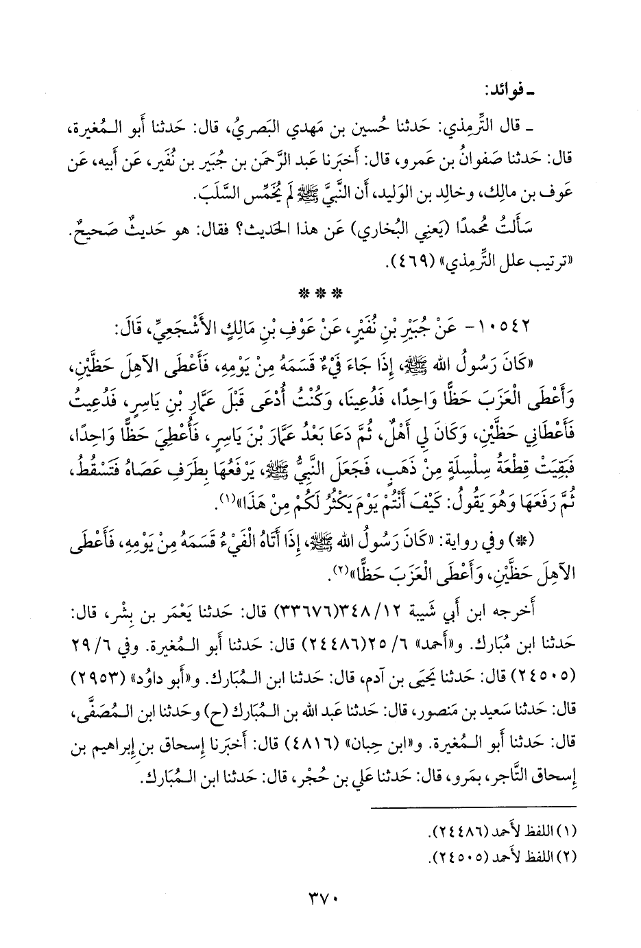 - قال التِّرمِذي: حدثنا حسين بن مهدي البصري، قال: حدثنا أَبو المغيرة، قال: حدثنا صفوان بن عَمرو، قال: أخبرنا عبد الرَّحمَن بن جُبير بن نُفير، عن أبيه، عن عوف بن مالك، وخالد بن الوليد، أن النبي صَلى الله عَليه وسَلم لم يخمس السلب.