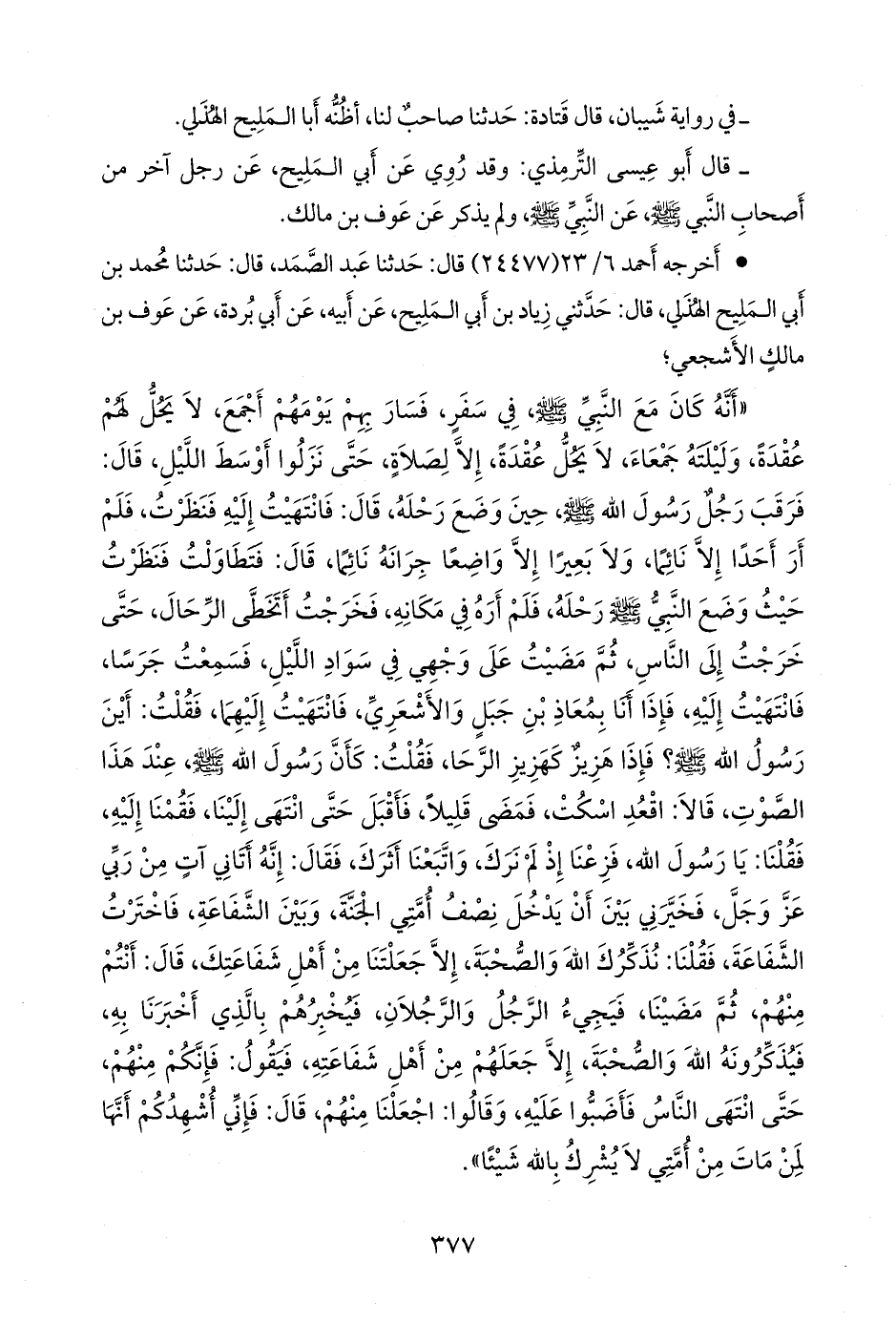 «أنه كان مع النبي صَلى الله عَليه وسَلم في سفر، فسار بهم يومهم أجمع، لا يحل لهم عقدة، وليلته جمعاء، لا يحل عقدة، إلا لصلاة، حتى نزلوا أوسط الليل، قال: فرقب رجل رسول الله صَلى الله عَليه وسَلم حين وضع رحله، قال: فانتهيت إليه فنظرت، فلم أر أحدا إلا نائما، ولا بعيرا إلا واضعا جرانه نائما، قال: فتطاولت فنظرت حيث وضع النبي صَلى الله عَليه وسَلم رحله، فلم أره في مكانه، فخرجت أتخطى الرحال، حتى خرجت إلى الناس، ثم مضيت على وجهي في سواد الليل، فسمعت جرسا، فانتهيت إليه، فإذا أنا بمعاذ بن جبل والأشعري، فانتهيت إليهما، فقلت: أين رسول الله صَلى الله عَليه وسَلم؟ فإذا هزيز كهزيز الرحا، فقلت: كأن رسول الله صَلى الله عَليه وسَلم عند هذا الصوت، قالا: اقعد اسكت، فمضى قليلا، فأقبل حتى انتهى إلينا، فقمنا إليه، فقلنا: يا رسول الله، فزعنا إذ لم نرك، واتبعنا أثرك، فقال: إنه أتاني آت من ربي عز وجل، فخيرني بين أن يدخل نصف أمتي الجنة، وبين الشفاعة، فاخترت الشفاعة، فقلنا: نذكرك الله والصحبة، إلا جعلتنا من أهل شفاعتك، قال: أنتم منهم، ثم مضينا، فيجيء الرجل والرجلان، فيخبرهم بالذي أخبرنا به، فيذكرونه الله والصحبة، إلا جعلهم من أهل شفاعته، فيقول: فإنكم منهم، حتى انتهى الناس فأضبوا عليه، وقالوا: اجعلنا منهم، قال: فإني أشهدكم أنها لمن مات من أمتي لا يشرك بالله شيئا».