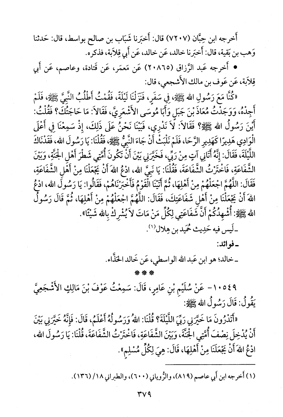 «كنا مع رسول الله صَلى الله عَليه وسَلم في سفر، فنزلنا ليلة، فقمت أَطلب النبي صَلى الله عَليه وسَلم فلم أَجده، ووجدت معاذ بن جبل وأَبا موسى الأَشعري، فقالا: ما حاجتك؟ فقلت: أَين رسول الله صَلى الله عَليه وسَلم؟ فقالا: لا ندري، فبينا نحن على ذلك، إِذ سمعنا في أَعلى الوادي هزيزا كهزيز الرحى (¬١)، فلم نلبث أَن جاءَ النبي صَلى الله عَليه وسَلم فقلنا: يا رسول الله، فقدناك الليلة، فقال: إِنه أَتاني آت من ربي، فخيرني بين أَن تكون أُمتي شطر أَهل الجنة، وبين الشفاعة، فاخترت الشفاعة، فقلنا: يا نبي الله، ادع الله أَن يجعلنا من أَهل الشفاعة، فقال: اللهم اجعلهم من أَهلها، ثم أَتينا القوم فأَخبرناهم، فقالوا: يا رسول الله، ادع الله أَن يجعلنا من أَهل شفاعتك، فقال: اللهم اجعلهم من أَهلها، ثم قال رسول الله صَلى الله عَليه وسَلم: أُشهدكم أَن شفاعتي لكل من مات لا يشرك بالله شيئًا».