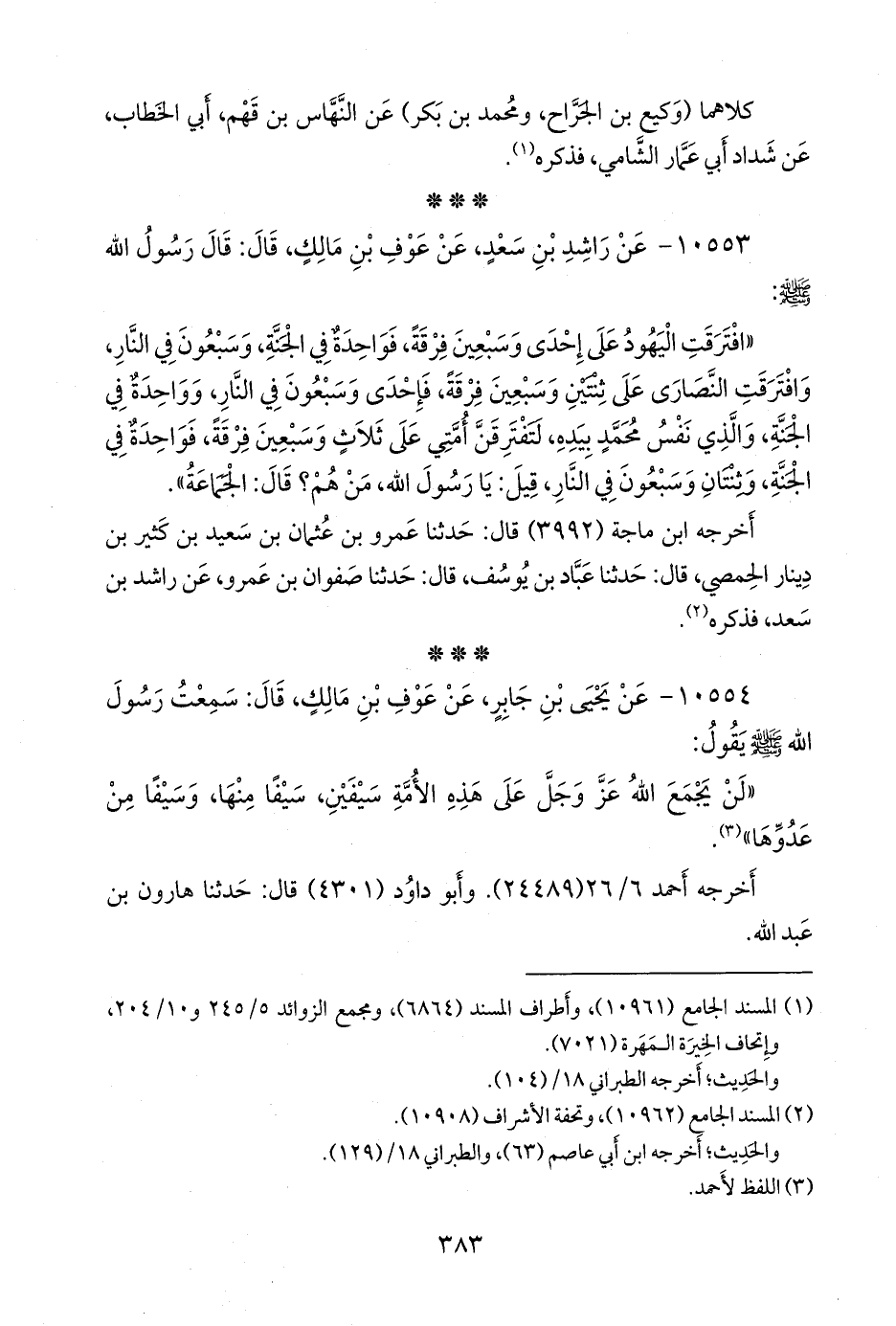 «افترقت اليهود على إحدى وسبعين فرقة، فواحدة في الجنة، وسبعون في النار، وافترقت النصارى على ثنتين وسبعين فرقة، فإحدى وسبعون في النار، وواحدة في الجنة، والذي نفس محمد بيده، لتفترقن أمتي على ثلاث وسبعين فرقة، فواحدة في الجنة، وثنتان وسبعون في النار، قيل: يا رسول الله، من هم؟ قال: الجماعة».