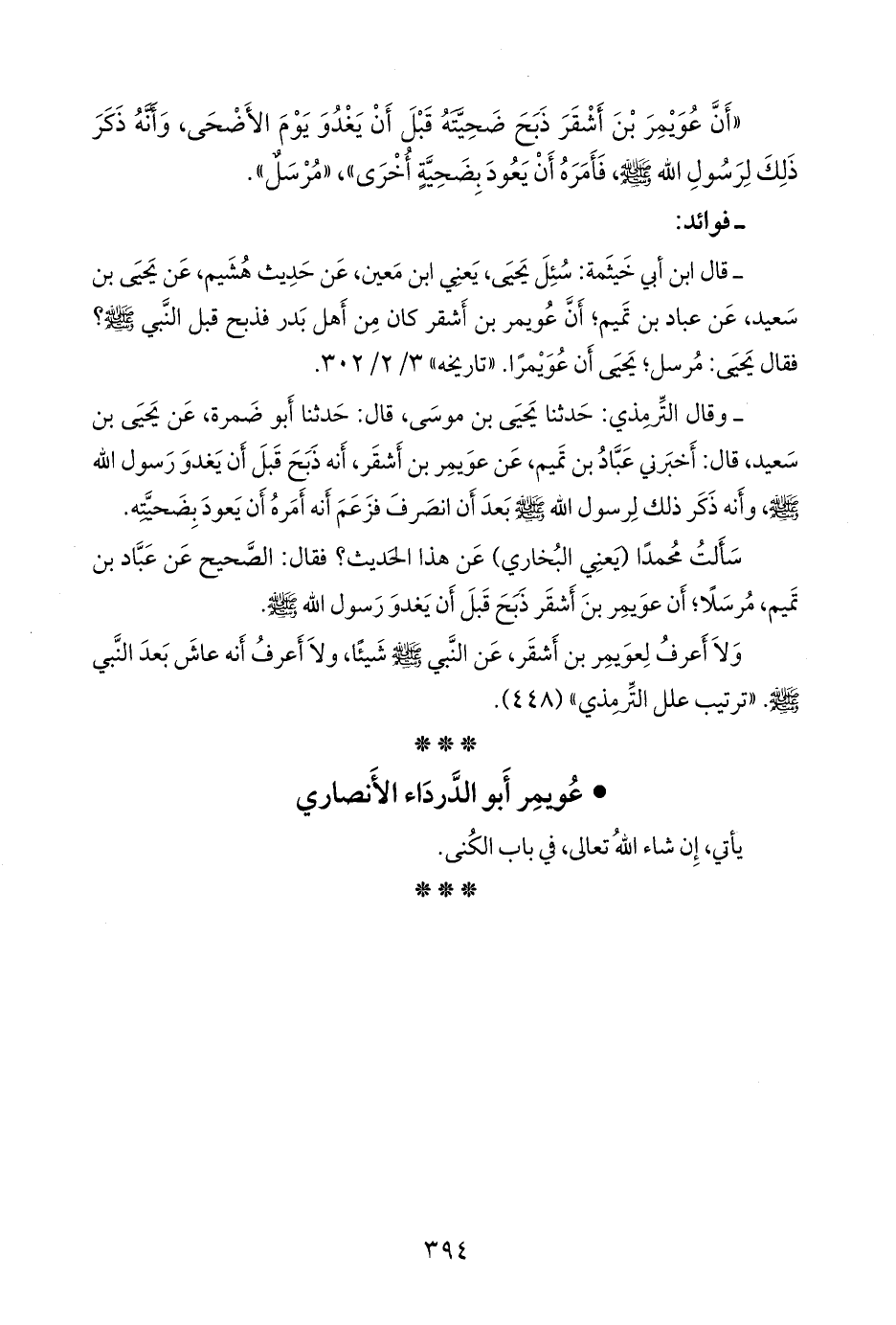 - وقال التِّرمِذي: حدثنا يحيى بن موسى، قال: حدثنا أَبو ضمرة، عن يحيى بن سعيد، قال: أخبرني عباد بن تميم، عن عويمر بن أشقر، أنه ذبح قبل أن يغدو رسول الله صَلى الله عَليه وسَلم وأنه ذكر ذلك لرسول الله صَلى الله عَليه وسَلم بعد أن انصرف فزعم أنه أمره أن يعود بضحيته.