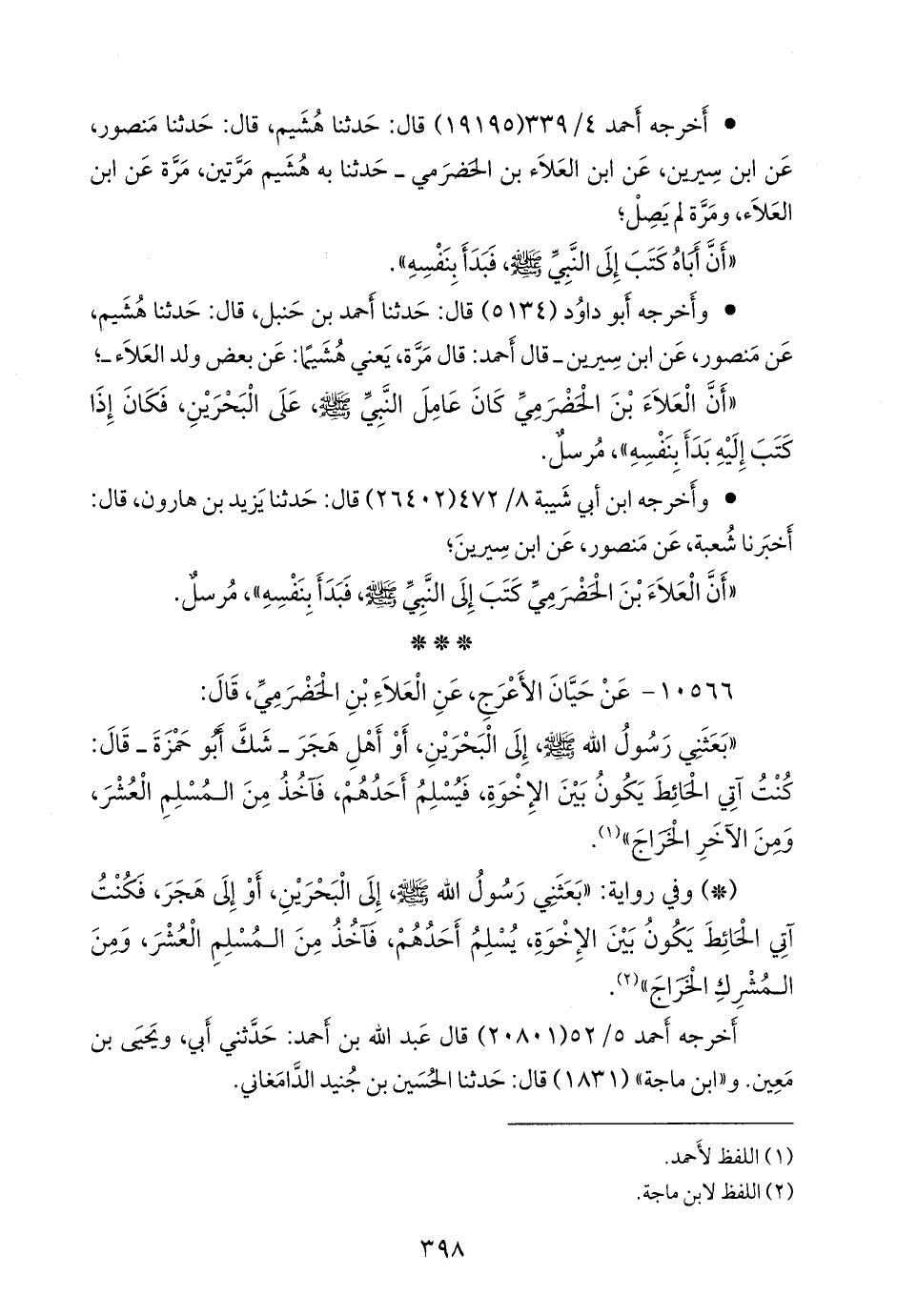 «بعثني رسول الله صَلى الله عَليه وسَلم إلى البحرين، أو أهل هجر ـ شك أَبو حمزة ـ قال: كنت آتي الحائط يكون بين الإخوة، فيسلم أحدهم، فآخذ من المسلم العشر، ومن الآخر الخراج» (¬١).