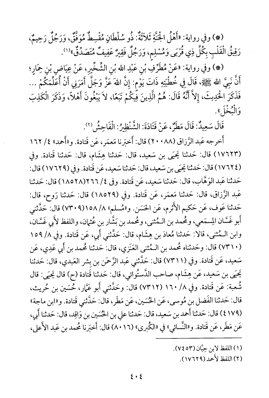 أخرجه عبد الرزاق (٢٠٠٨٨) قال: أخبرنا معمر، عن قتادة. و «أحمد» ٤/ ١٦٢ (١٧٦٢٣) قال: حدثنا يحيى بن سعيد، قال: حدثنا هشام، قال: حدثنا قتادة. وفي (١٧٦٢٤) قال: حدثنا يحيى بن سعيد، قال: حدثنا سعيد، عن قتادة. وفي (١٧٦٢٩) قال: حدثنا عبد الوَهَّاب، قال: حدثنا سعيد، عن قتادة. وفي ٤/ ٢٦٦ (١٨٥٢٨) قال: حدثنا عبد الرزاق، قال: حدثنا مَعمَر، عن قتادة. وفي (١٨٥٢٩) قال: حدثنا روح، قال: حدثنا عوف، عن حكيم الأثرم، عن الحسن. و «مسلم» ٨/ ١٥٨ (٧٣٠٩) قال: حدثني أَبو غسان المسمعي، ومحمد بن المثنى، ومحمد بن بشار بن عثمان، واللفظ لأبي غسان، وابن المثنى، قالا: حدثنا معاذ بن هشام، قال: حدثني أبي، عن قتادة. وفي ٨/ ١٥٩ (٧٣١٠) قال: وحدثناه محمد بن المثنى العنزي، قال: حدثنا محمد بن أَبي عَدي، عن سعيد، عن قتادة. وفي (٧٣١١) قال: حدثني عبد الرَّحمَن بن بشر العبدي، قال: حدثنا يحيى بن سعيد، عن هشام، صاحب الدَّستوائي، قال: حدثنا قتادة (ح) قال يحيى: قال شعبة: عن قتادة. وفي ٨/ ١٦٠ (٧٣١٢) قال: وحدثني أَبو عمار، حسين بن حريث، قال: حدثنا الفضل بن موسى، عن الحسين، عن مطر، قال: حدثني قتادة. و «ابن ماجة» (٤١٧٩) قال: حدثنا أحمد بن سعيد، قال: حدثنا علي بن الحسين بن واقد، قال: حدثنا أبي، عن مطر، عن قتادة. و «النَّسَائي» في «الكبرى» (٨٠١٦) قال: أخبرنا محمد بن عبد الأعلى،