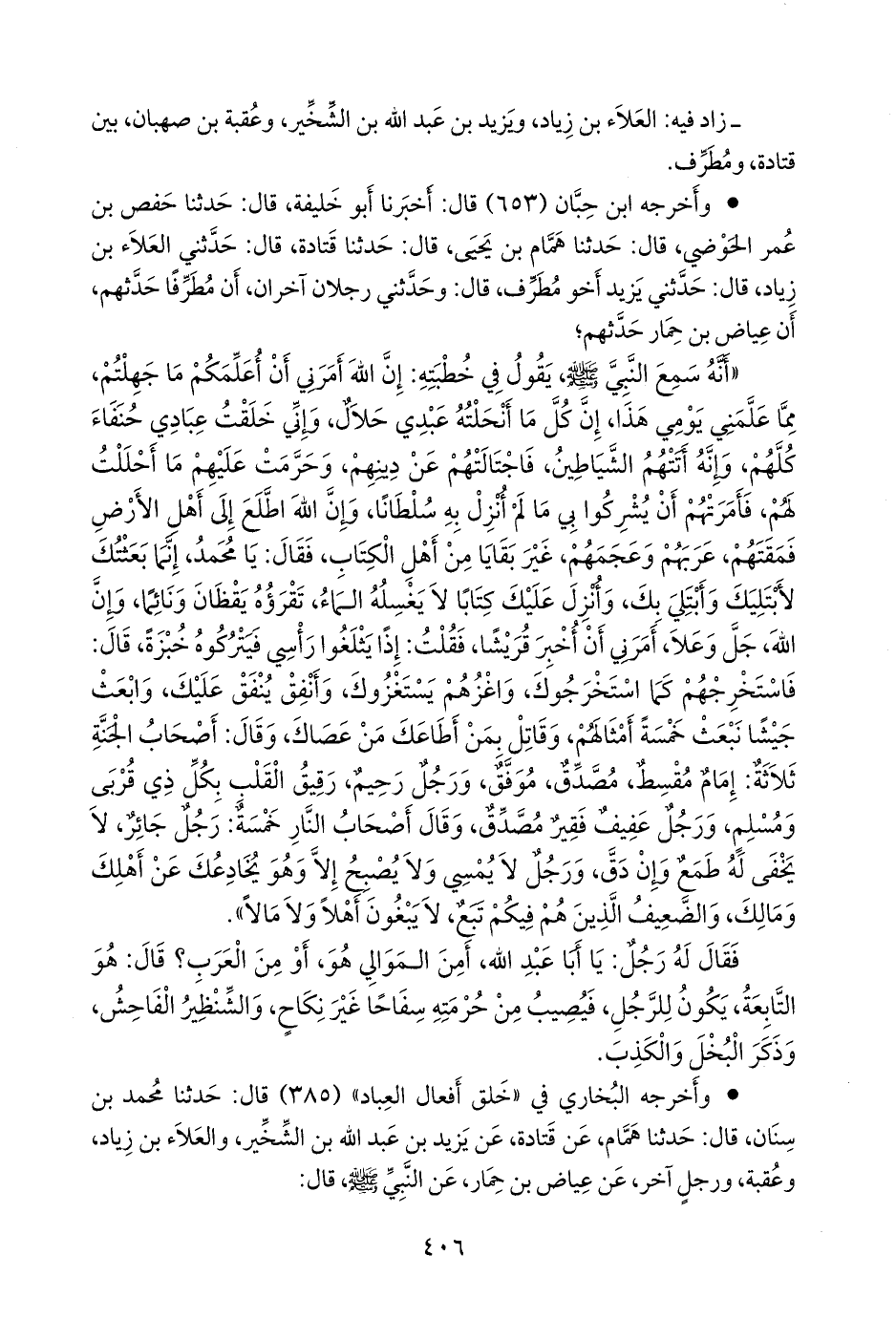 • وأخرجه البخاري في «خلق أفعال العباد» (٣٨٥) قال: حدثنا محمد بن سنان، قال: حدثنا همام، عن قتادة، عن يزيد بن عبد الله بن الشخير، والعلاء بن زياد، وعقبة، ورجل آخر، عن عياض بن حمار، عن النبي صَلى الله عَليه وسَلم قال: