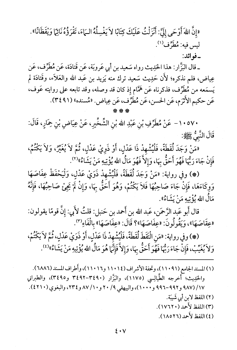 - وفي رواية: «من التقط لقطة، فليشهد ذا عدل، أو ذوي عدل، ثم لا يكتم، ولا يغيب، فإن جاء ربها فهو أحق بها، وإلا فإنما هو مال الله يؤتيه من يشاء» (¬٣).