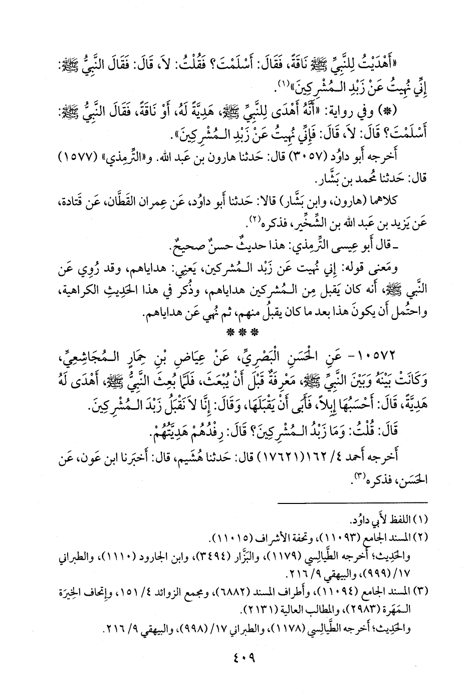 ١٠٥٧٢ - عن الحسن البصري، عن عياض بن حمار المجاشعي، وكانت بينه وبين النبي صَلى الله عَليه وسَلم معرفة قبل أن يبعث، فلما بعث النبي صَلى الله عَليه وسَلم أهدى له هدية، قال: أحسبها إبلا، فأبى أن يقبلها، وقال: إنا لا نقبل زبد المشركين.
