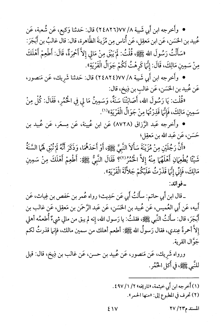- قال عبد الرَّحمَن بن أبي حاتم الرازي: سألتُ أبي عن حديثٍ؛ رواه عمر بن حفص بن غياث، عن أبيه، عن أبي العميس، عن عبيد بن الحسن، عن عبد الرَّحمَن بن معقل، عن غالب بن أبجر، قال: سألت النبي صَلى الله عَليه وسَلم فقلت: يا رسول الله، إنه لم يبق من مالي شيء أطعمه أهلي إلا أحمرة عندي، فقال رسول الله صَلى الله عَليه وسَلم: أطعم أهلك من سمين مالك، فإنما قذرت لكم جوال القرية.