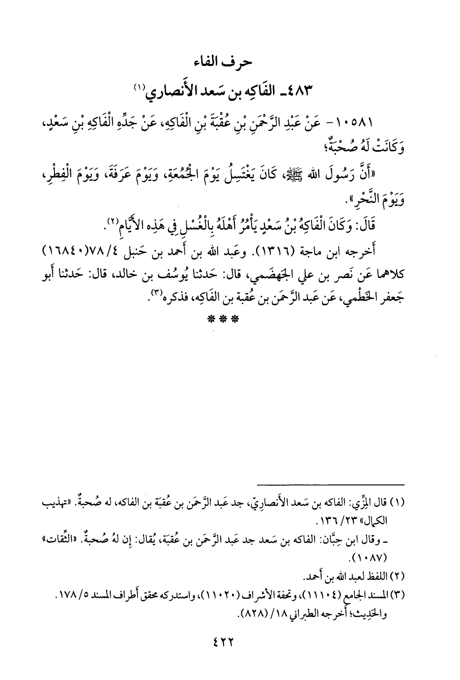 (¬١) قال المِزِّي: الفاكه بن سعد الأَنصاري، جد عبد الرَّحمَن بن عُقبة بن الفاكه، له صحبة. «تهذيب الكمال» ٢٣/ ١٣٦.