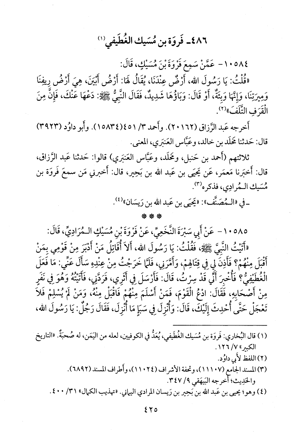 (¬١) قال البخاري: فروة بن مسيك الغطيفي، يعد في الكوفيين، لعله من اليمن، له صحبة. «التاريخ الكبير» ٧/ ١٢٦.