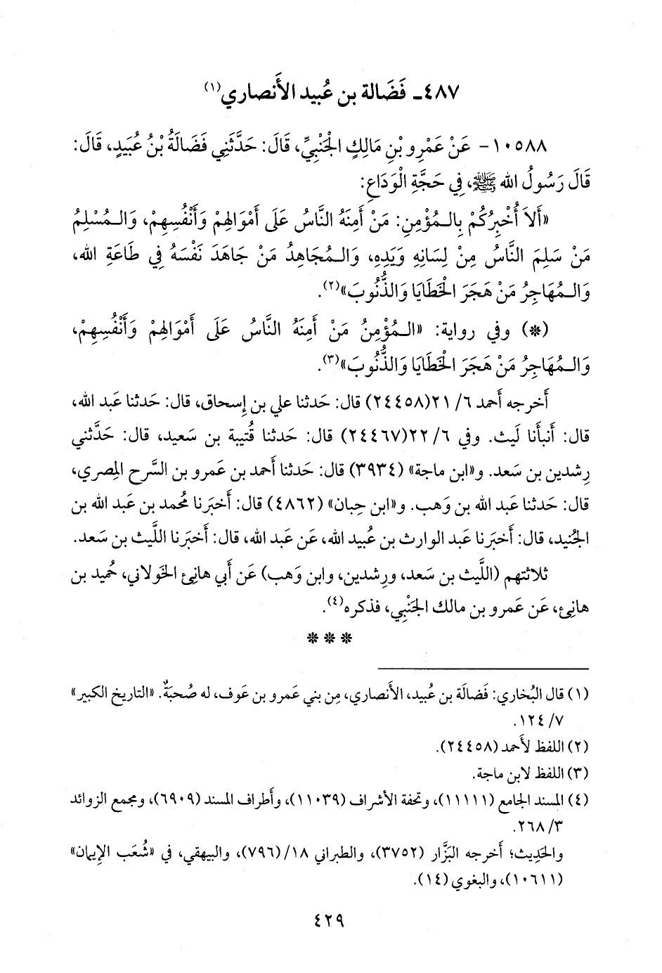 «ألا أخبركم بالمؤمن: من أمنه الناس على أموالهم وأنفسهم، والمسلم من سلم الناس من لسانه ويده، والمجاهد من جاهد نفسه في طاعة الله، والمهاجر من هجر الخطايا والذنوب» (¬٢).