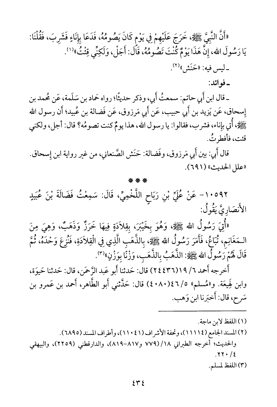 - قال عبد الرَّحمَن بن أبي حاتم الرازي: سمعت أبي، وذكر حديثا؛ رواه حماد بن سلمة، عن محمد بن إسحاق، عن يزيد بن أبي حبيب، عن أبي مرزوق، عن فضالة بن عبيد؛ أن رسول الله صَلى الله عَليه وسَلم أتي بإناء، فشرب، فقالوا: يا رسول الله، هذا يوم كنت تصومه؟ قال: أجل، ولكني قئت، فأفطرت.