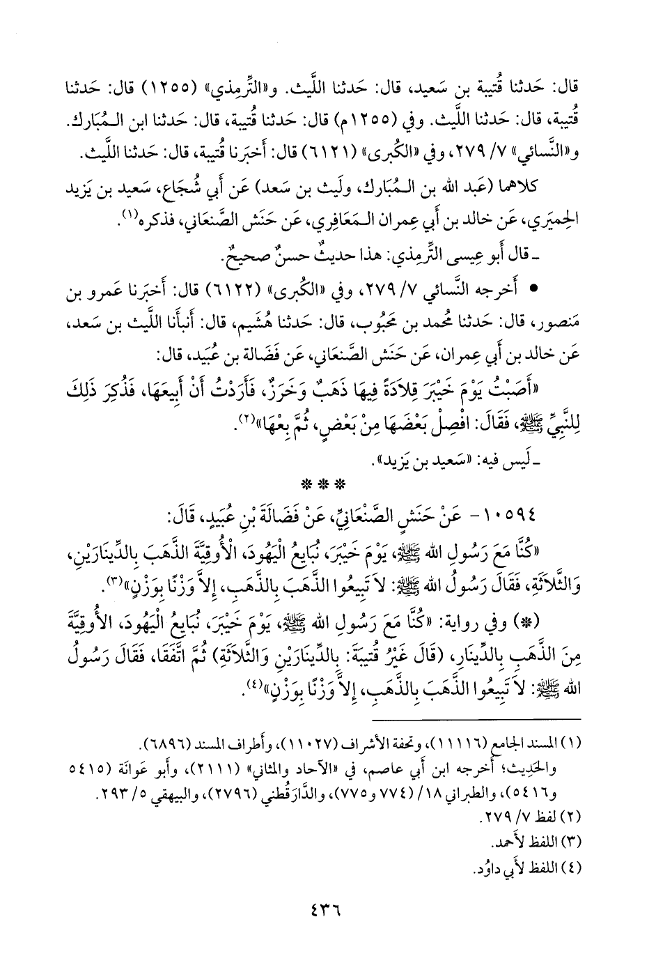- وفي رواية: «كنا مع رسول الله صَلى الله عَليه وسَلم يوم خيبر، نبايع اليهود، الأوقية من الذهب بالدينار، (قال غير قتيبة: بالدينارين والثلاثة) ثم اتفقا، فقال رسول الله صَلى الله عَليه وسَلم: لا تبيعوا الذهب بالذهب، إلا وزنا بوزن» (¬٢).