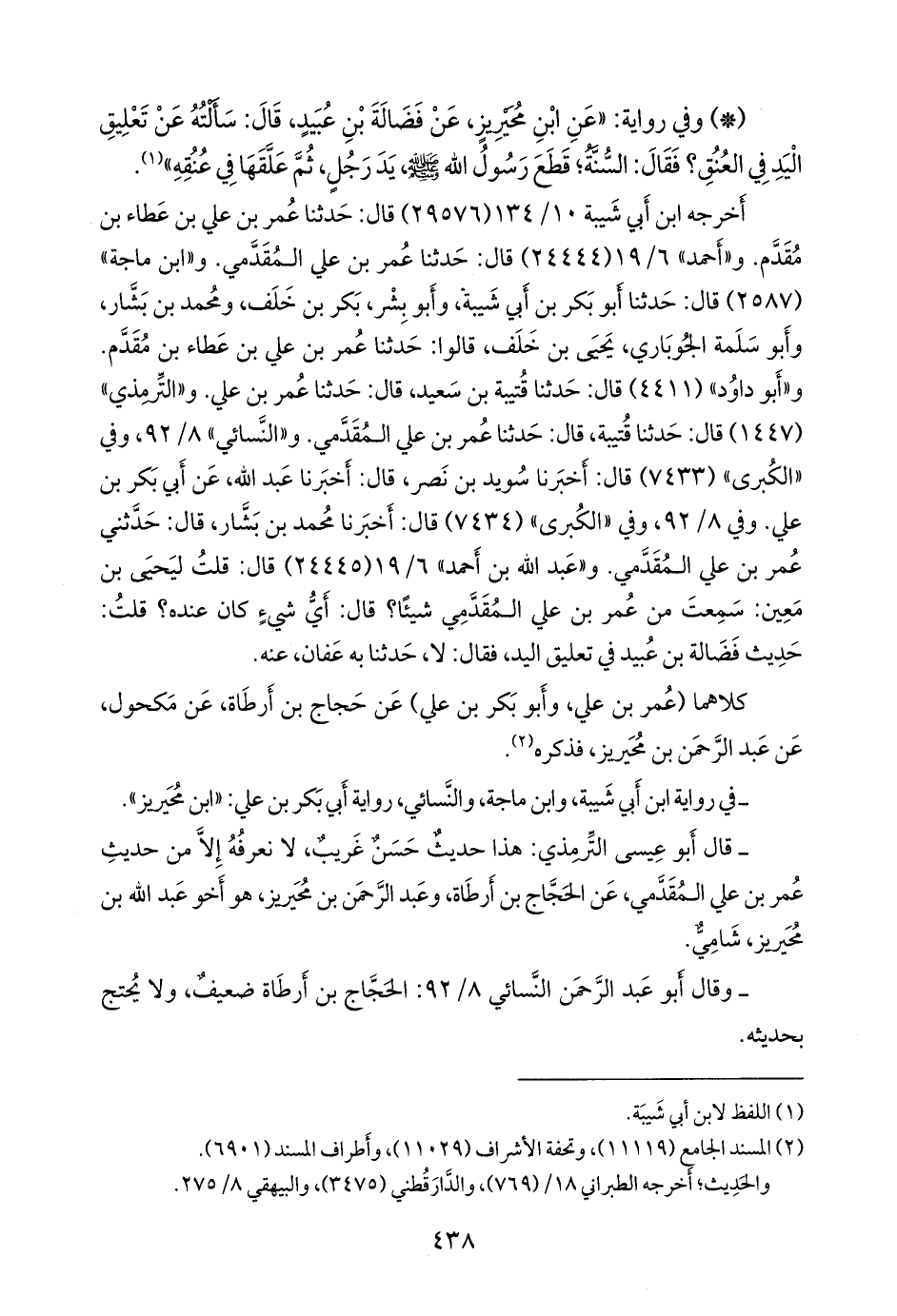 و «التِّرمِذي» (١٤٤٧) قال: حدثنا قتيبة، قال: حدثنا عمر بن علي المقدمي. و «النَّسَائي» ٨/ ٩٢، وفي «الكبرى» (٧٤٣٣) قال: أخبرنا سويد بن نصر، قال: أخبرنا عبد الله، عن أَبي بكر بن علي. وفي ٨/ ٩٢، وفي «الكبرى» (٧٤٣٤) قال: أخبرنا محمد بن بشار، قال: حدثني عمر بن علي المقدمي. و «عبد الله بن أحمد» ٦/ ١٩ (٢٤٤٤٥) قال: قلت ليحيى بن مَعين: سمعت من عمر بن علي المقدمي شيئا؟ قال: أي شيء كان عنده؟ قلت: حديث فضالة بن عبيد في تعليق اليد، فقال: لا، حدثنا به عفان، عنه.
