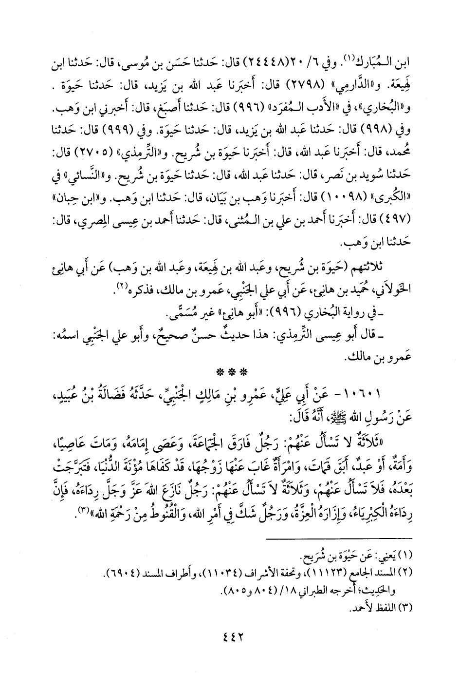(¬١) في الموضع (٩٩٩) «حدثنا عبد الله، قال: أَخبرنا حَيْوة بن شُريح»، وكذلك في عامة النسخ الخطية عدا نُسخَتَي خُدابخش والمكتبة الأزهرية، ففيهما: «حدثنا محمد حدثنا عبد الله».