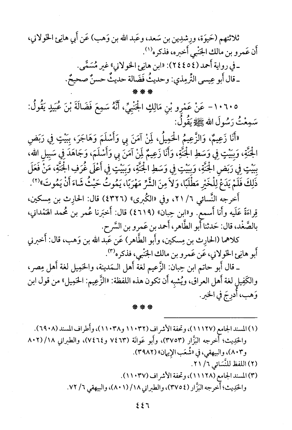 «أنا زعيم، والزعيم الحميل، لمن آمن بي وأسلم وهاجر، ببيت في ربض الجنة، وببيت في وسط الجنة، وأنا زعيم لمن آمن بي وأسلم، وجاهد في سبيل الله، ببيت في ربض الجنة، وببيت في وسط الجنة، وببيت في أعلى غرف الجنة، من فعل ذلك فلم يدع للخير مطلبا، ولا من الشر مهربا، يموت حيث شاء أن يموت» (¬١).