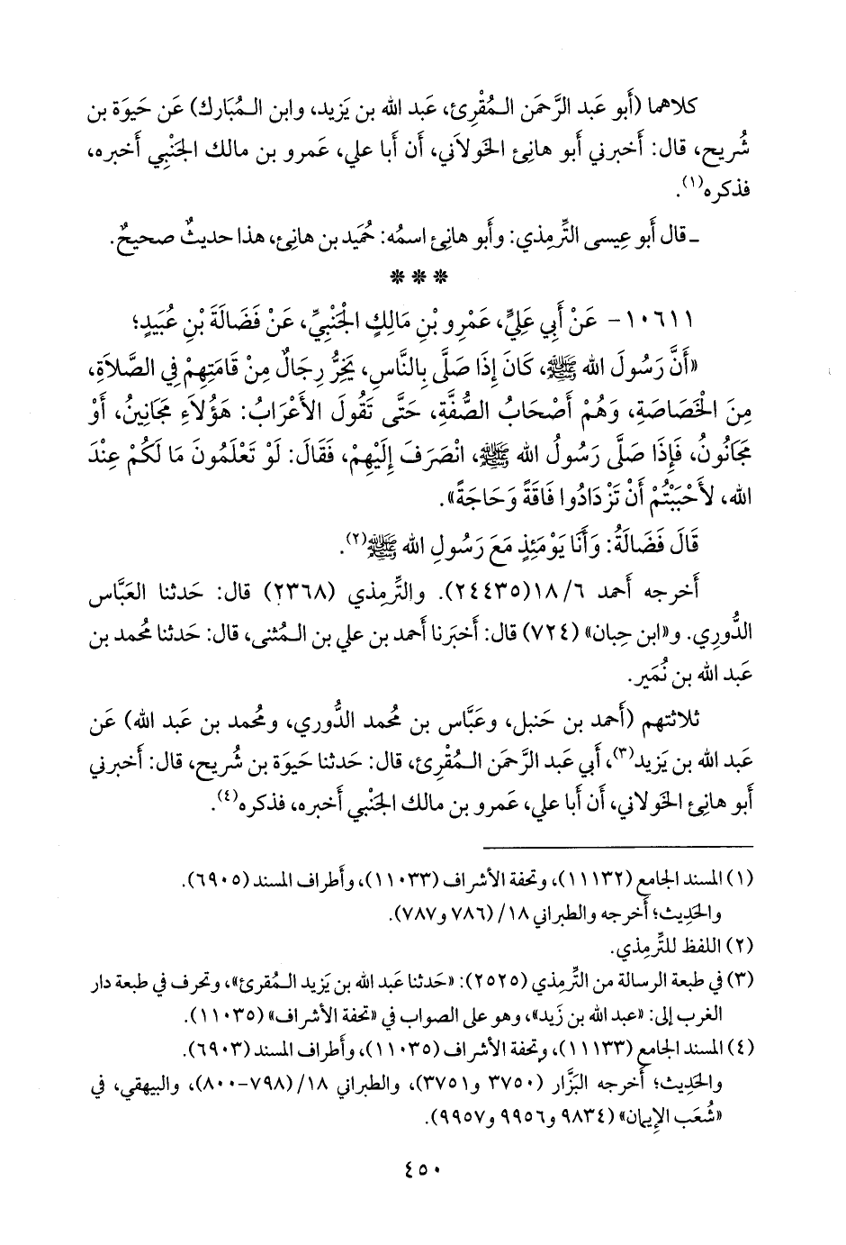 ثلاثتهم (أحمد بن حنبل، وعباس بن محمد الدوري، ومحمد بن عبد الله) عن عبد الله بن يزيد (¬٢) أبي عبد الرَّحمَن المُقرِئ، قال: حدثنا حَيْوَة بن شُرَيح، قال: أخبرني أَبو هانئ الخَولاني، أن أبا علي، عَمرو بن مالك الجنبي أخبره، فذكره (¬٣).