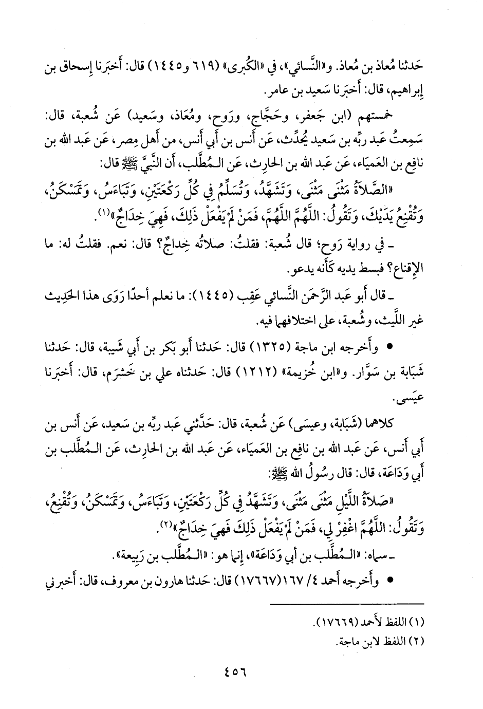 خمستهم (ابن جعفر، وحجاج، وروح، ومعاذ، وسعيد) عن شعبة، قال: سمعت عبد رَبِّه بن سعيد يحدث، عن أَنس بن أبي أنس، من أهل مصر، عن عبد الله بن نافع بن العمياء، عن عبد الله بن الحارث، عن المطلب، أن النبي صَلى الله عَليه وسَلم قال: