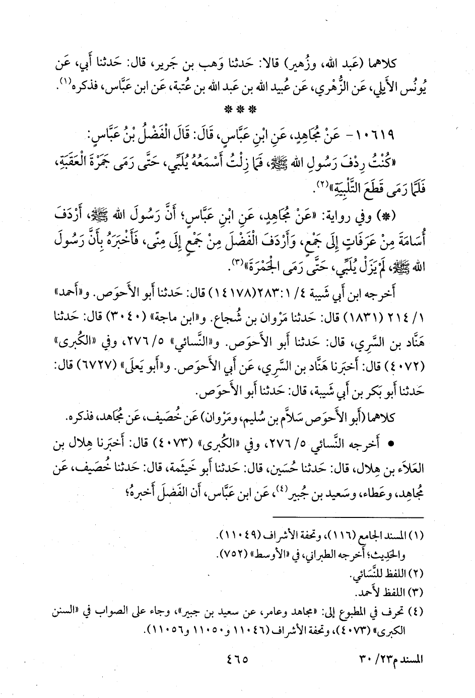 - وفي رواية: «عن مجاهد، عن ابن عباس؛ أن رسول الله صَلى الله عَليه وسَلم أردف أُسامة من عرفات إلى جمع، وأردف الفضل من جمع إلى منى، فأخبره بأن رسول الله صَلى الله عَليه وسَلم لم يزل يلبي، حتى رمى الجمرة» (¬٢).