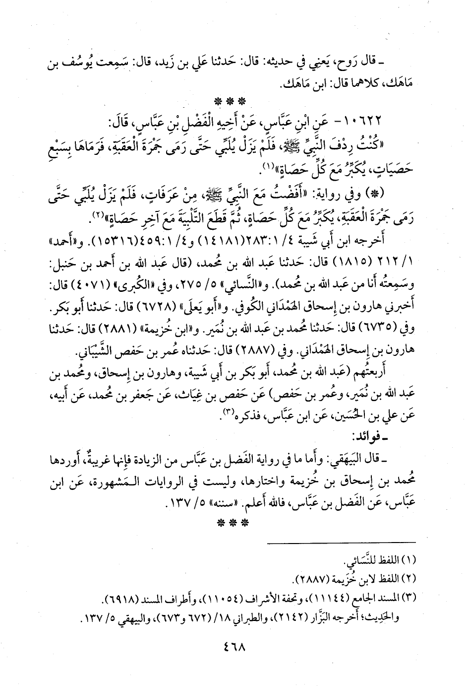 - قال البيهقي: وأما ما في رواية الفضل بن عباس من الزيادة فإنها غريبة، أوردها محمد بن إسحاق بن خزيمة واختارها، وليست في الروايات المشهورة، عن ابن عباس، عن الفضل بن عباس، فالله أعلم. «سننه» ٥/ ١٣٧.