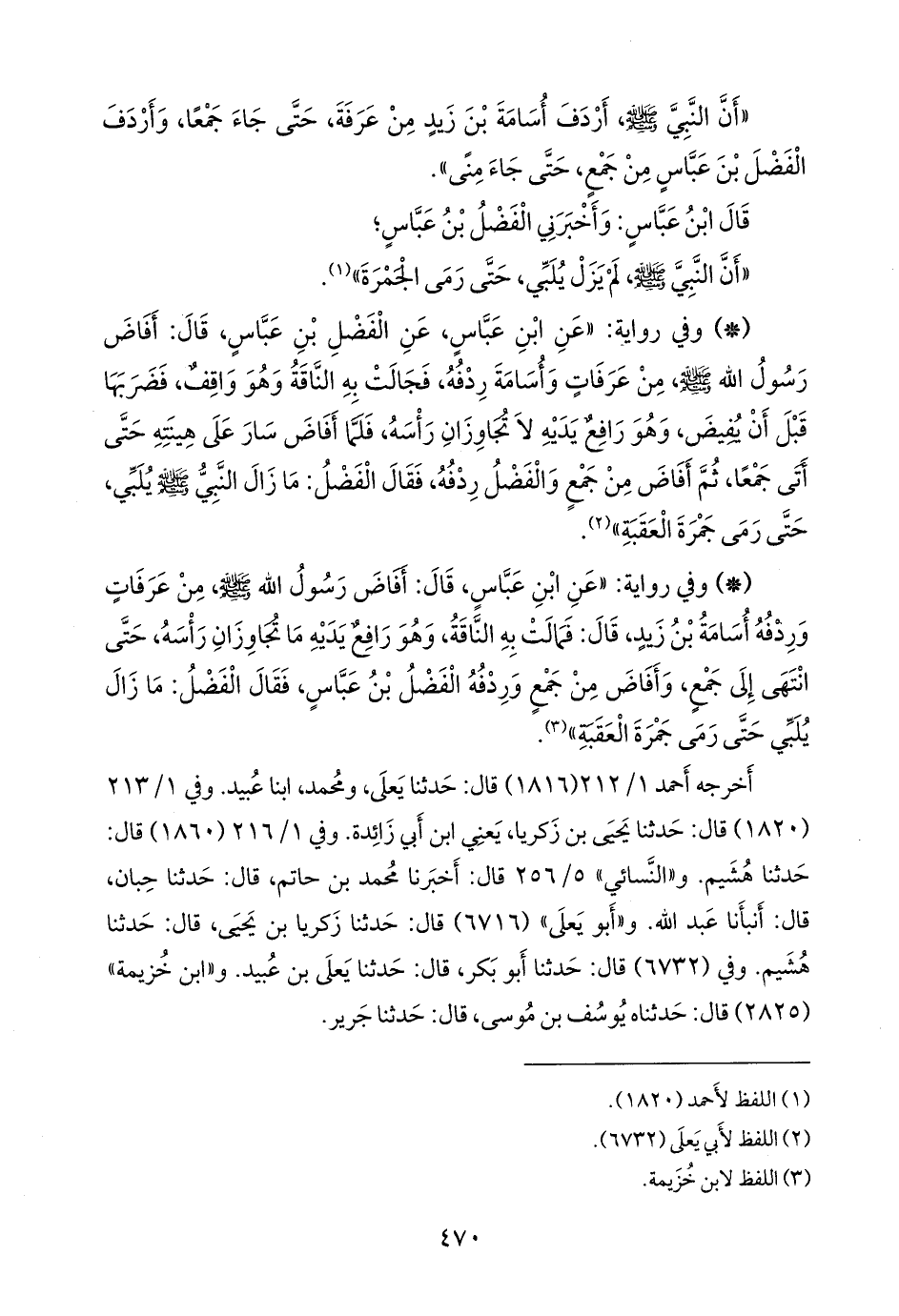 - وفي رواية: «عن ابن عباس، قال: أفاض رسول الله صَلى الله عَليه وسَلم من عرفات وردفه أُسامة بن زيد، قال: فمالت به الناقة، وهو رافع يديه ما تجاوزان رأسه، حتى انتهى إلى جمع، وأفاض من جمع وردفه الفضل بن عباس، فقال الفضل: ما زال يلبي حتى رمى جمرة العقبة» (¬١).
