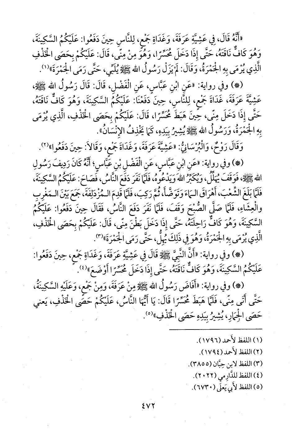 - وفي رواية: «أفاض رسول الله صَلى الله عَليه وسَلم من عرفة، ومن جمع، وعليه السكينة، حتى أتى منى، فلما هبط محسرا قال: يا أيها الناس، عليكم حصى الخذف، يعني حصى الجمار، يشير بيده حصى الخذف» (¬٢).