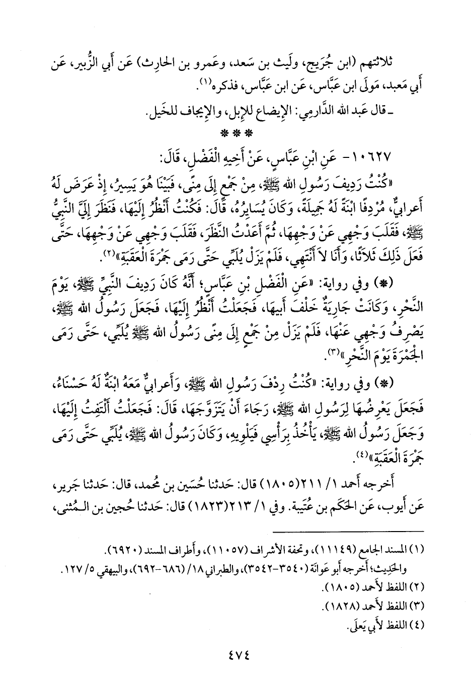 - وفي رواية: «كنت ردف رسول الله صَلى الله عَليه وسَلم وأعرابي معه ابنة له حسناء، فجعل الأعرابي يعرضها لرسول الله صَلى الله عَليه وسَلم رجاء أن يتزوجها، قال: فجعلت ألتفت إليها، وجعل رسول الله صَلى الله عَليه وسَلم يأخذ برأسي فيلويه، وكان رسول الله صَلى الله عَليه وسَلم يلبي حتى رمى جمرة العقبة» (¬٣).