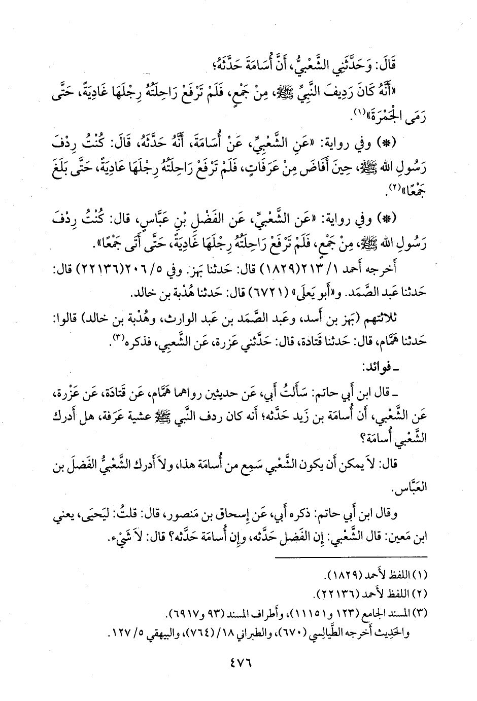 - قال عبد الرَّحمَن بن أبي حاتم الرازي: سألت أبي، عن حديثين رواهما همام، عن قتادة، عن عَزرة، عن الشعبي، أن أُسامة بن زيد حدثه؛ أنه كان ردف النبي صَلى الله عَليه وسَلم عشية عرفة، هل أدرك الشعبي أُسامة؟