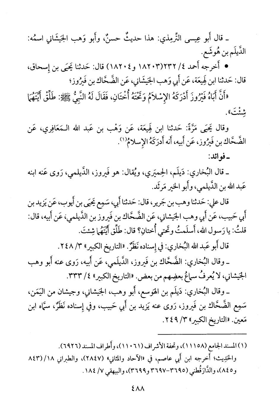 - وقال البخاري: الضحاك بن فيروز، الديلمي، عن أبيه، روى عنه أَبو وهب الجيشاني، لا يعرف سماع بعضهم من بعض. «التاريخ الكبير» ٤/ ٣٣٣.