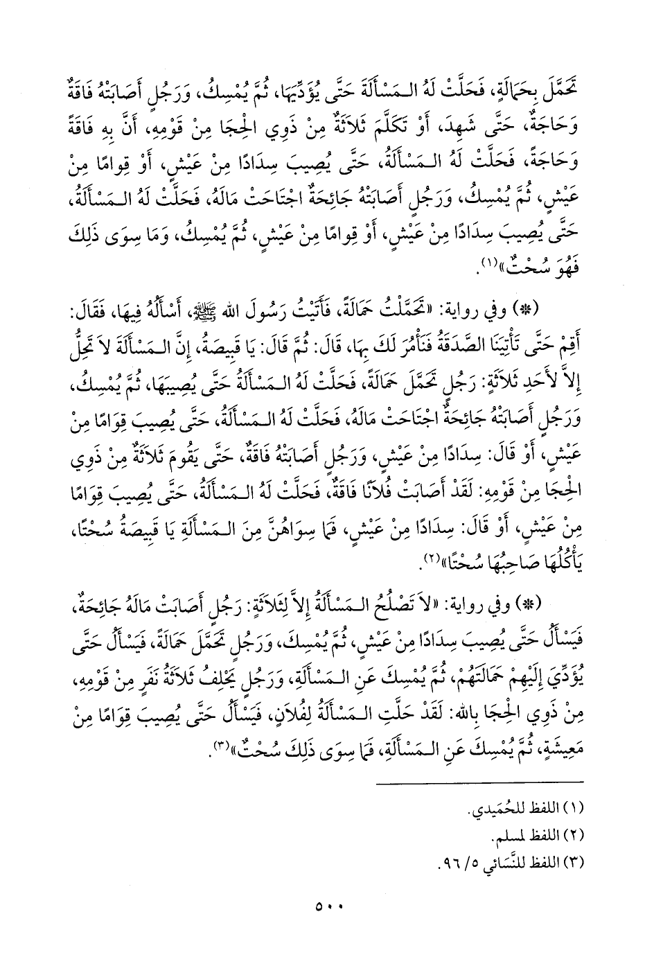 - وفي رواية: «لا تصلح المسألة إلا لثلاثة: رجل أصابت ماله جائحة، فيسأل حتى يصيب سدادا من عيش، ثم يمسك، ورجل تحمل حمالة، فيسأل حتى يؤدي إليهم حمالتهم، ثم يمسك عن المسألة، ورجل يحلف ثلاثة نفر من قومه، من ذوي الحجا بالله: لقد حلت المسألة لفلان، فيسأل حتى يصيب قواما من معيشة، ثم يمسك عن المسألة، فما سوى ذلك سحت» (¬١).