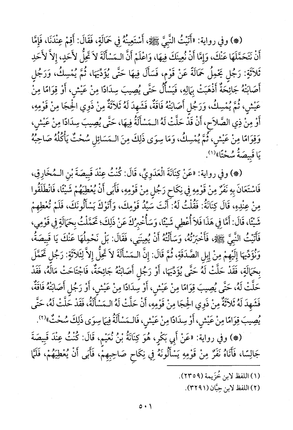 - وفي رواية: «عن كنانة العدوي، قال: كنت عند قَبيصَة بن المخارق، فاستعان به نفر من قومه في نكاح رجل من قومه، فأبى أن يعطيهم شيئا، فانطلقوا من عنده، قال كنانة: فقلت له: أنت سيد قومك، وأتوك يسألونك، فلم تعطهم شيئا، قال: أما في هذا فلا أعطي شيئا، وسأخبرك عن ذلك؛ تحملت بحمالة في قومي، فأتيت النبي صَلى الله عَليه وسَلم فأخبرته، وسألته أن يعينني، فقال: بل نحملها عنك يا قَبيصَة، ونؤديها إليهم من إبل الصدقة، ثم قال: إن المسألة لا تحل إلا لثلاثة: رجل تحمل بحمالة، فقد حلت له حتى يؤديها، أو رجل أصابته جائحة، فاجتاحت ماله، فقد حلت له، حتى يصيب قواما من عيش، أو سدادا من عيش، أو رجل أصابته فاقة، فشهد له ثلاثة من ذوي الحجا من قومه، أن حلت له المسألة، فقد حلت له، حتى يصيب قواما من عيش، أو سدادا من عيش، فالمسألة فيما سوى ذلك سحت» (¬١).