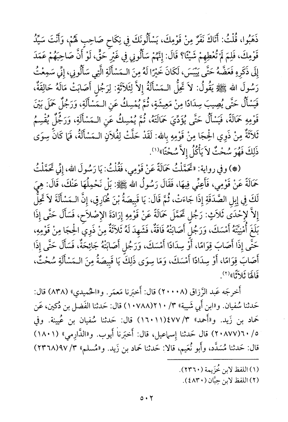 - وفي رواية: «تحملت حمالة عن قومي، فقلت: يا رسول الله، إني تحملت حمالة عن قومي، فأعني فيها، فقال رسول الله صَلى الله عَليه وسَلم: بل نحملها عنك، قال: هي لك في إبل الصدقة إذا جاءت، ثم قال: يا قَبيصَة بن مخارق، إن المسألة لا تحل إلا لإحدى ثلاث: رجل تحمل حمالة عن قومه إرادة الإصلاح، فسأل حتى إذا بلغ أمنيته أمسك، ورجل أصابته فاقة، فشهد له ثلاثة من ذوي الحجا من قومه، حتى إذا أصاب قواما، أو سدادا أمسك، ورجل أصابته جائحة، فسأل حتى إذا أصاب قواما، أو سدادا أمسك، وما سوى ذلك يا قَبيصَة من المسألة سحت، قالها ثلاثا» (¬١).