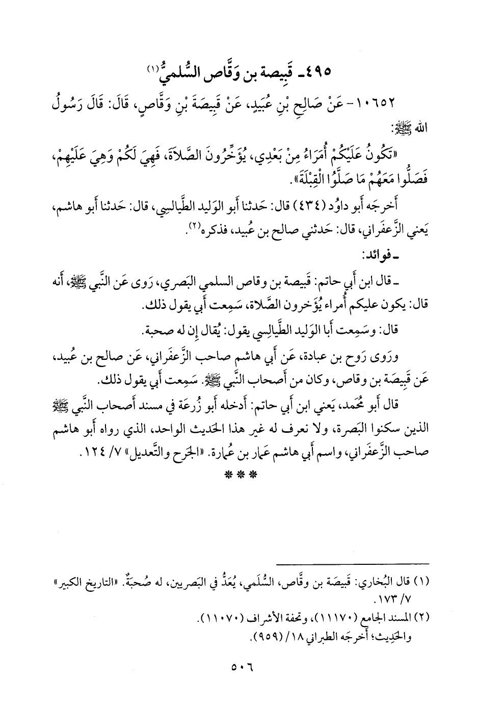 - قال عبد الرَّحمَن بن أبي حاتم الرازي: قَبيصَة بن وقاص السلمي البصري، روى عن النبي صَلى الله عَليه وسَلم أنه قال: يكون عليكم أمراء يؤخرون الصلاة، سمعت أبي يقول ذلك.