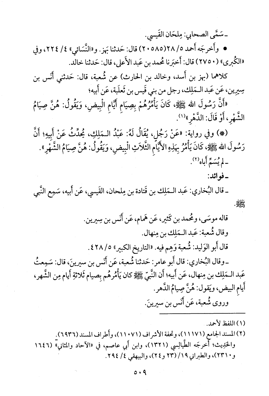 حدثنا أَبو الوليد الطيالسي، قال: حدثنا شعبة، قال: أخبرني أَنس بن سِيرين، قال: سمعت عبد الملك بن ملحان، عن أبيه، وكان مع النبي صَلى الله عَليه وسَلم أن النبي صَلى الله عَليه وسَلم كان يأمرهم بصيام البيض، ويقول: هن صيام الشهر.
