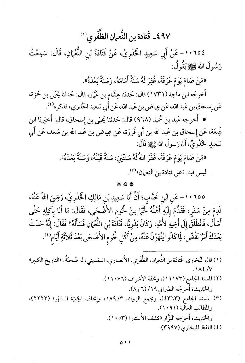 (¬١) قال البخاري: قتادة بن النعمان، الظفري، الأَنصاري، المديني، له صحبة. «التاريخ الكبير» ٧/ ١٨٤.