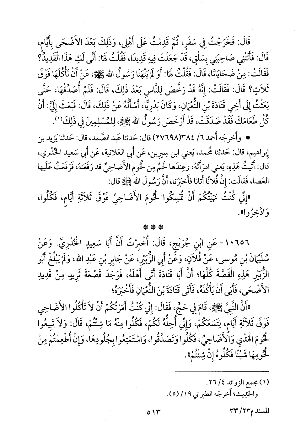 «أن أبا سعيد الخُدْري أتى أهله، فوجد قصعة من قديد الأضحى، فأبى أن يأكله، فأتى قتادة بن النعمان، فأخبره؛ أن النبي صَلى الله عَليه وسَلم قام، فقال: إني كنت أمرتكم أن لا تأكلوا الأضاحي فوق ثلاثة أيام، لتسعكم، وإني أحله لكم، فكلوا منه ما شئتم، ولا تبيعوا لحوم الهدي والأضاحي، فكلوا وتصدقوا، واستمتعوا بجلودها ولا تبيعوها، وإن أطعمتم من لحمها فكلوا إن شئتم».